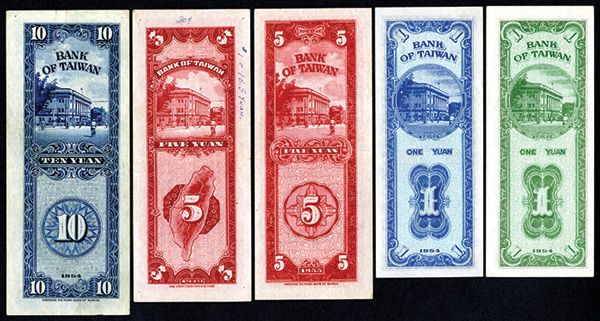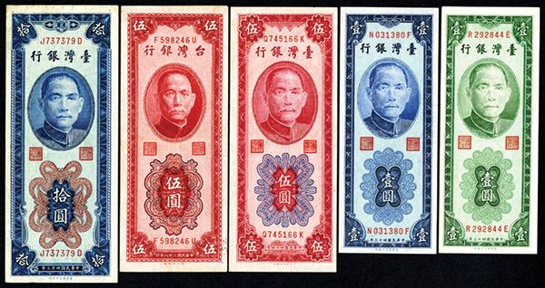 Taiwan, China. Lot of 5 notes, Highlights include 1953, 5 Yuan, P-1953 S/M#T73-12, XF to AU with 4 small pinholes in corner and graffiti on back, FPFT; 1954 Issues, 1 Yuan, Blue and 1 Yuan, green, Unc. to CU; 1954, 10 Yuan, Blue, P-1967, XF-AU; and 1955, 5 Yuan, P-1968, AU. Attractive group of notes with a scarce variety or two.