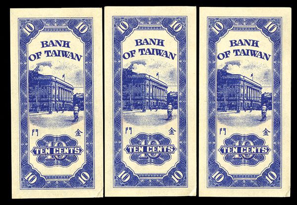 Taiwan, China. Lot of 3 notes. All are sequential 1950 (1952) notes, 10 cents, P-R103b S/M#T74-10b, Issued banknotes, Blue face, SYS top center, back blue, Vertical format, "Chin Men" overprint at middle and bottom of note on face. Sequential S/N's AA 403791 to AA 403793, All are superb AU-Unc. but would grade Choice to Gem Unc. but there is a minor corner tip bend on the lower left corner, Attractive banknotes. CPF.