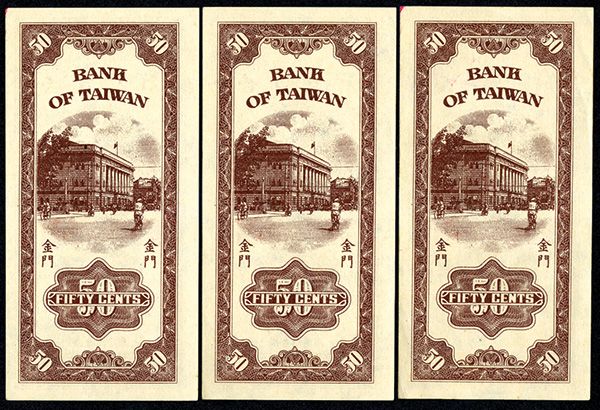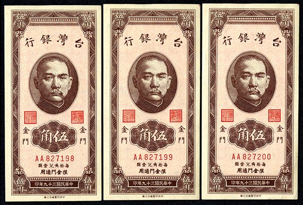 Taiwan, China. Lot of 3 notes. All are sequential 1950 (1952) notes, 50 cents, P-R104b S/M#T74-11, Issued banknotes, Brown on light orange red undertint on face, SYS top center, back brown, Vertical format, "Chin Men" overprint on left and right on back. Sequential S/N's AA 827198 to AA 827200, All would grade Choice to Gem Uncirculated. Attractive banknotes. CPF.
