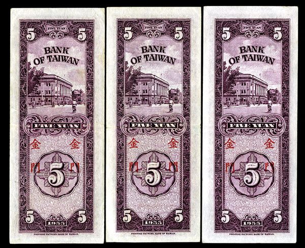 Taiwan, China. Lot of 3 notes. All are 1955 (1956), 5 Yuan, P-R108 S/M#T74-40, Issued banknotes, Violet face, SYS top center, back violet, Vertical format, 5 Chinese character overprint left and right vertically flanking denomination. 2 of the notes would grade Choice AU to Unc. and the other 2 would grade XF to AU condition. Attractive trio of banknotes. PFBT.