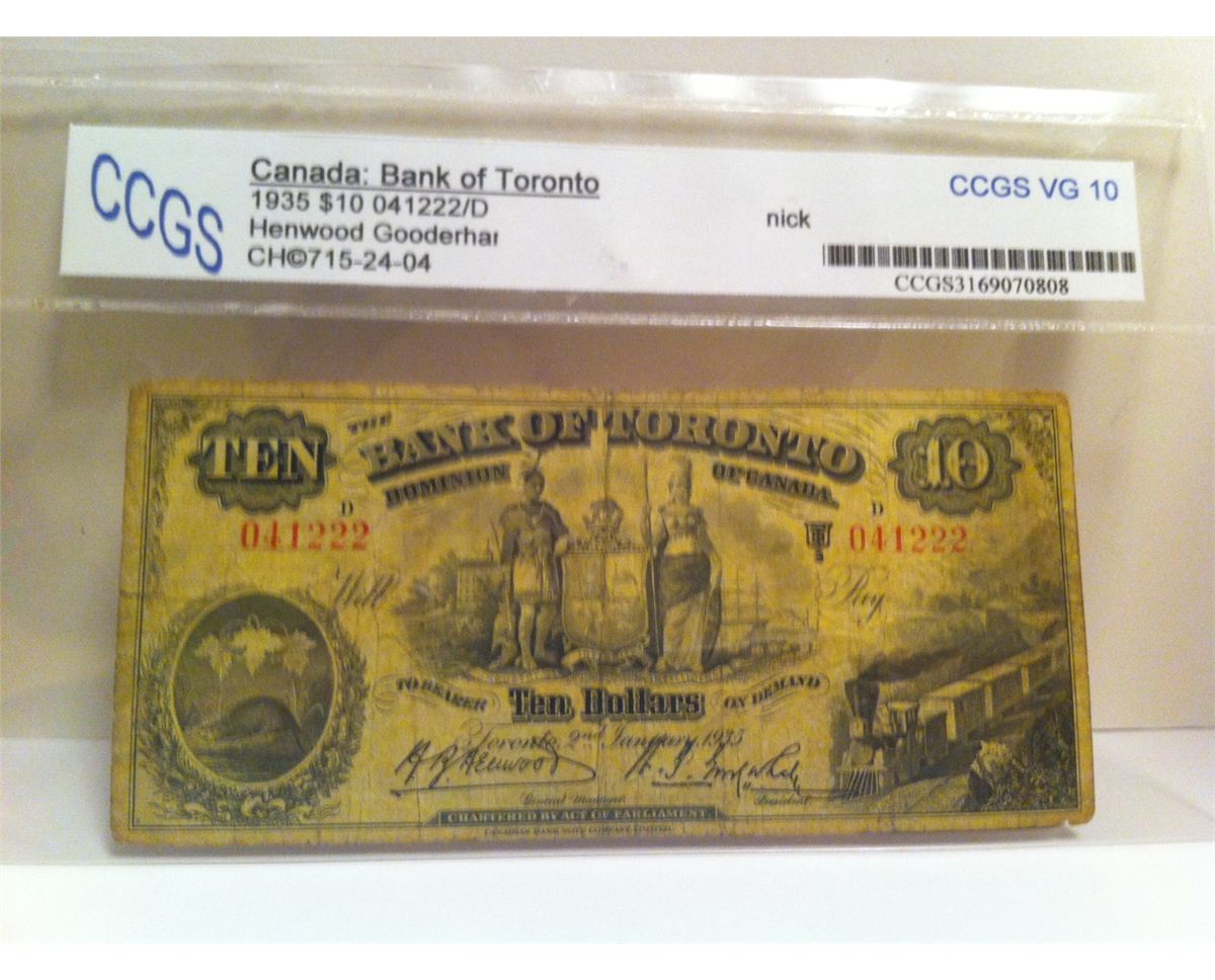 CCGS Certified (VG-10) Bank of Toronto. 1935 10.00 Dollar Note