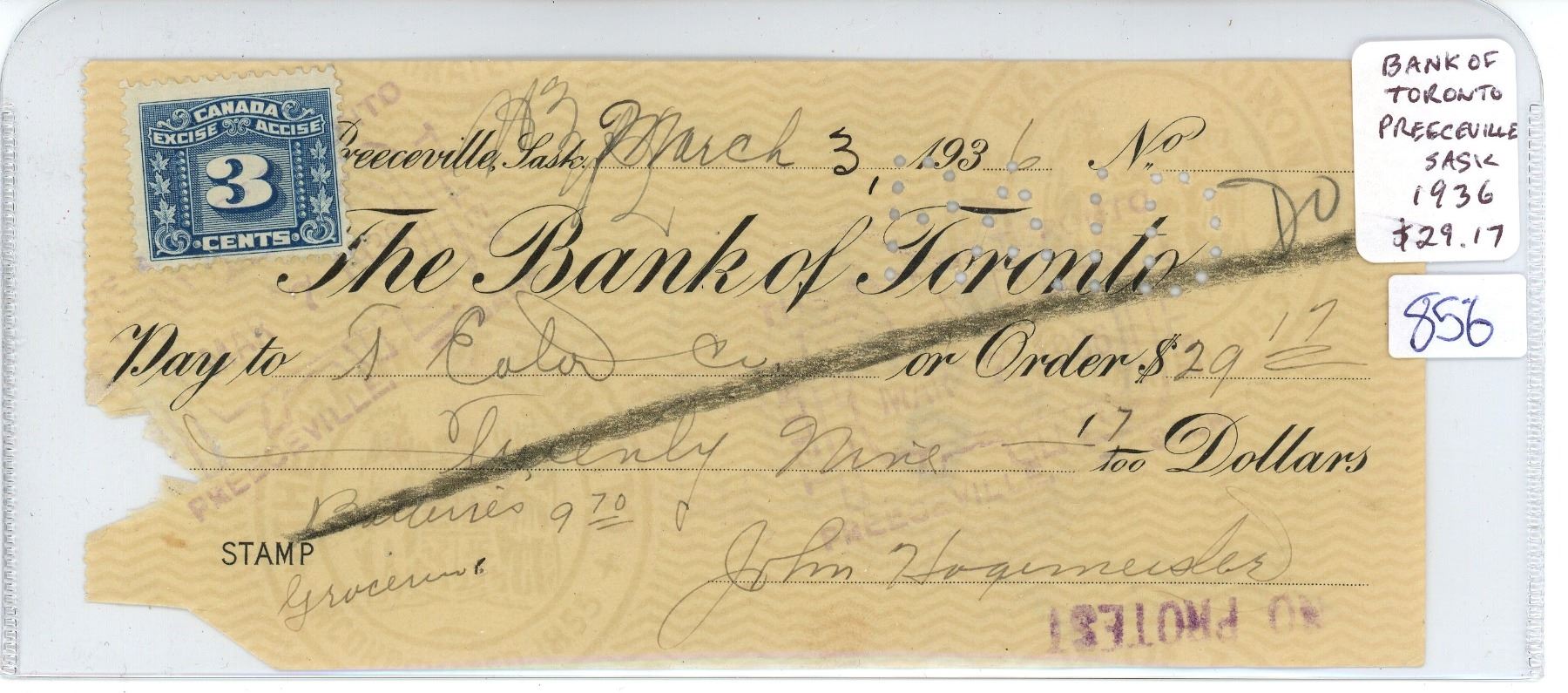 Bank of Toronto Preeceville, Sask. cancelled cheque. Dated 1936 in the amount of $29.17. Payable to Eatons.
