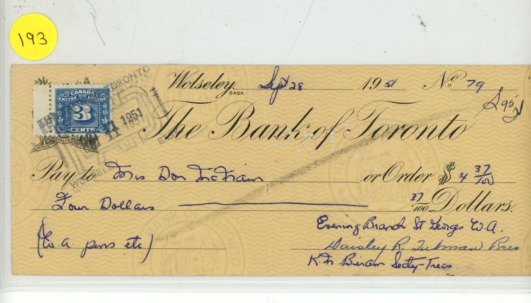 Bank of Toronto cancelled cheque from Wolseley, Sask. dated 1979 for $4.37 from the Women’s Auxiliary.