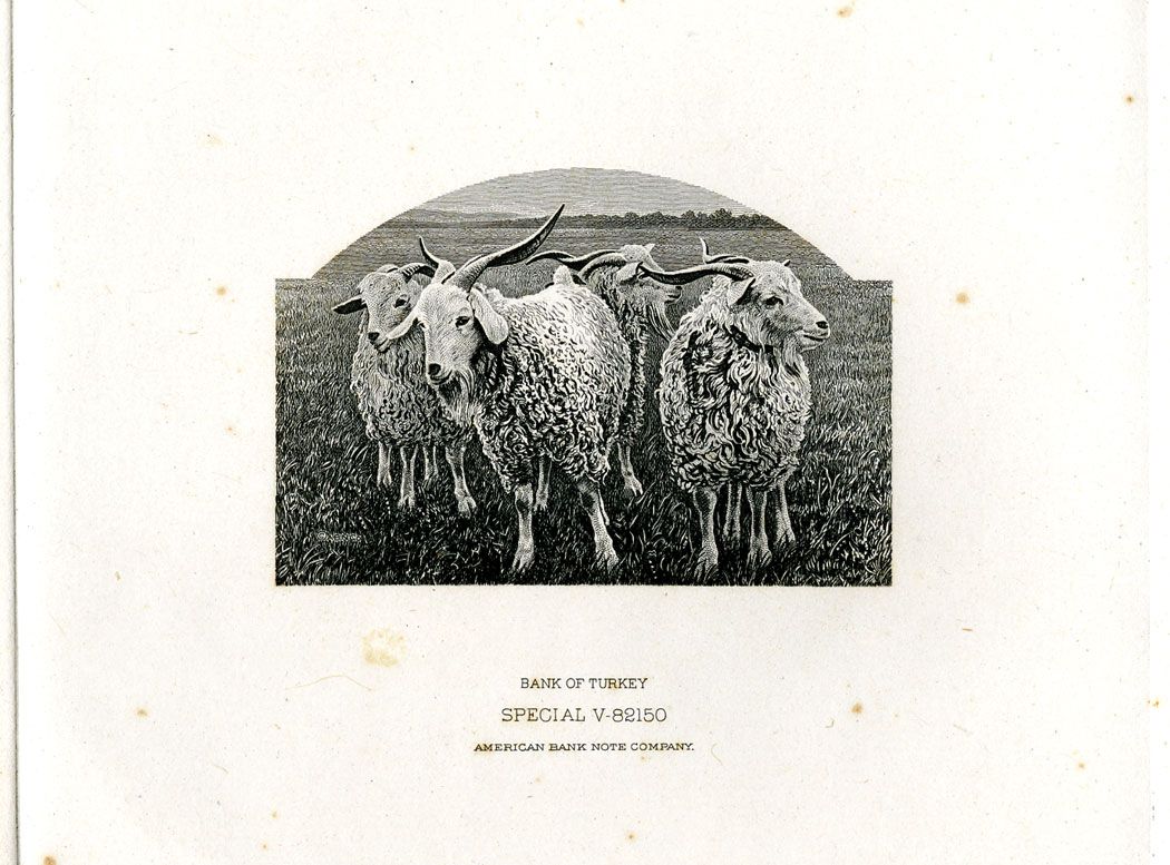 Turkey, ND (ca,1942-47). Proof vignette of goats used on the back of the ABNC 1942-47 printed Issue, 50 Lira, P-142; P-142a and P-143. Printed in black on india paper mounted to large card. Bottom has "Bank of TurkeyÒ (ca.1960's) imprint though ABNC only printed notes for the "Central Bank of Turkey" so this proof was possibly for an unissued ABN issue. 9 by 6 inches. Uncirculated condition with light foxing spots. Rare production vignette proof from ABNC archives.