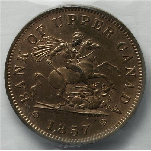 <B>Bank of Upper Canada Penny Token 1857,</B></I> BR-719, CH-PC6D, MS63 ICCS. Abundant mint red color remaining with a superb strike.