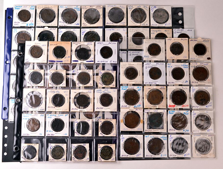 Bank of Upper Canada tokens, 1850 to 1857, Half Pennies, (44); Pennies, (34); grades range from Poor to VF, most VG to Fine, some damaged, holed, or with other problems. Should be viewed. Total of 78 coins