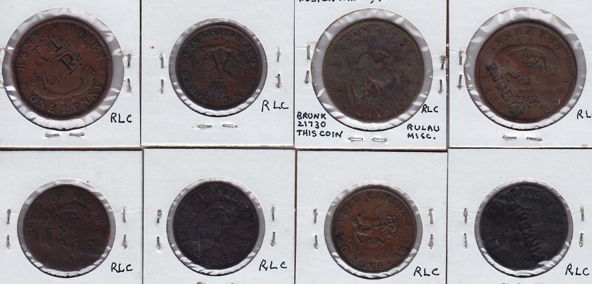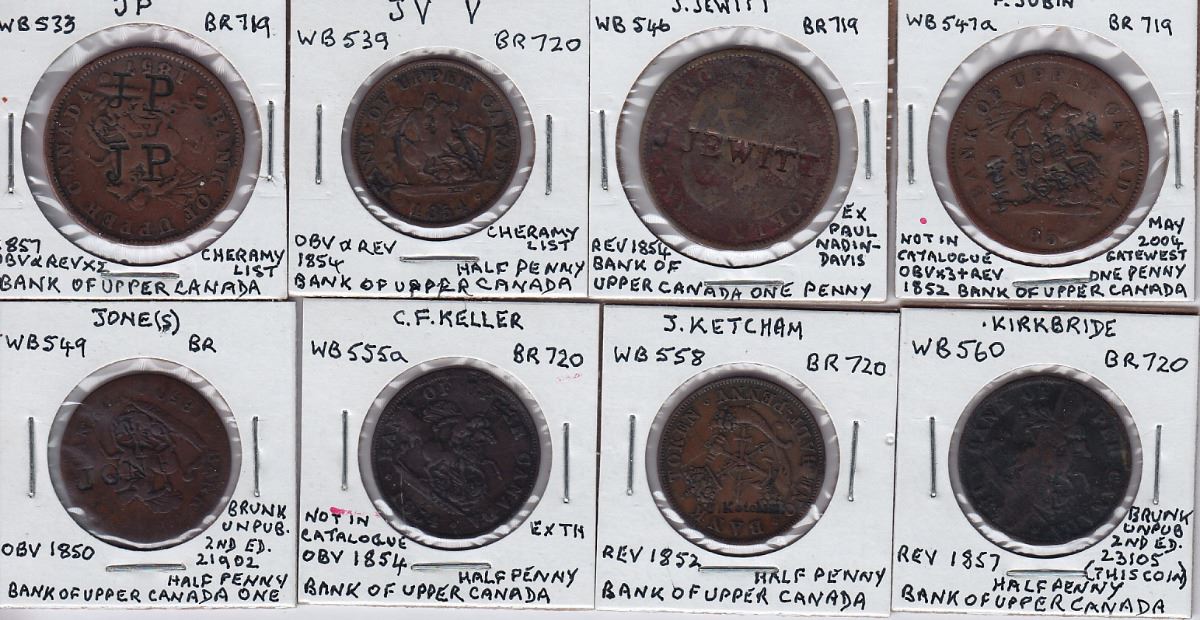 J.P. on obv. & rev. (twice each) of Bank of Upper Canada penny, 1857, Br 719 (M.I. 533); J V on obv. and V on rev., both counterpunched on Bank of Upper Canada ½ penny, 1854, Br 720 (M.I. 539); J. JEWITT on rev. of Bank of Upper Canada penny, 1854, Br 719 (M.I. 546, Brunk J-117); F. JOBIN on obv. & rev. of Bank of Upper Canada penny, 1852, Br 719 (Brunk J-121); JONE(S) on obv. of Bank of Upper Canada ½ penny, 1850, Br 720 (M.I. 549, Brunk J-178); C.F. KELLER on obv. & rev. of Bank of Upper Canada ½ penny, 1854, Br 720; J. Ketcham. on rev. of Bank of Upper Canada ½ penny, 1852, Br 720 (M.I. 558); .KIRKBRIDE. on rev. of Bank of Upper Canada ½ penny, 1857, Br 720 (M.I. 560, Brunk K-250). 8 Pcs.