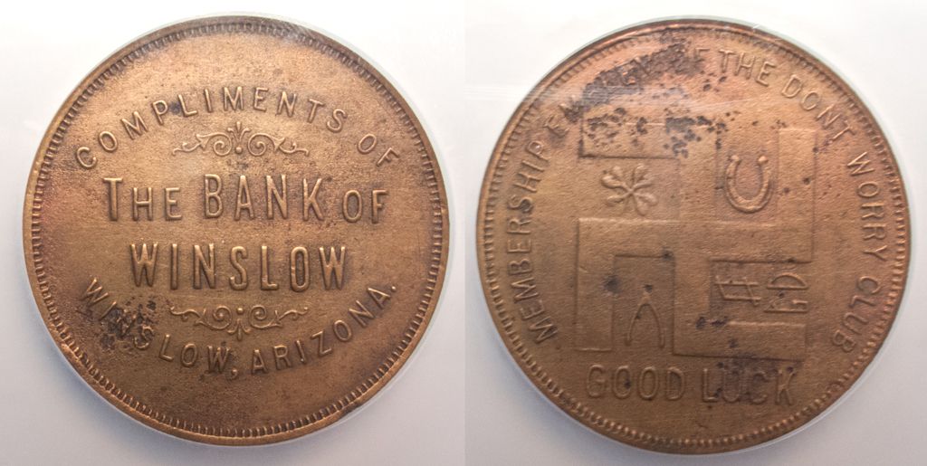 R9. Compliments of / Bank of Winslow / Winslow, Arizona // Membership emblem / The Don't Worry Cub / Good Luck. Many good luck symbols pictured: swastika, horseshoe, wishbone, etc.City: WinslowCounty: NavajoState: AZDate: