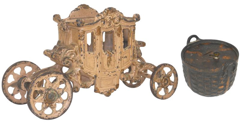 Bank, woven basket, cast iron w/orig bronze flashing, dime register, VG working cond, 3"H x 4"Dia & fancy cast iron carriage w/orig paint, La Tessa W. Co. cast on bottom, open at top, VG cond, 5"H x 9"L.