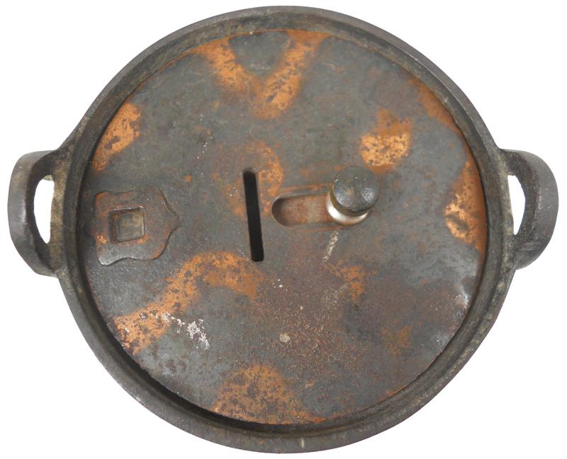 Bank, woven basket, cast iron w/orig bronze flashing, dime register, VG working cond, 3"H x 4"Dia &