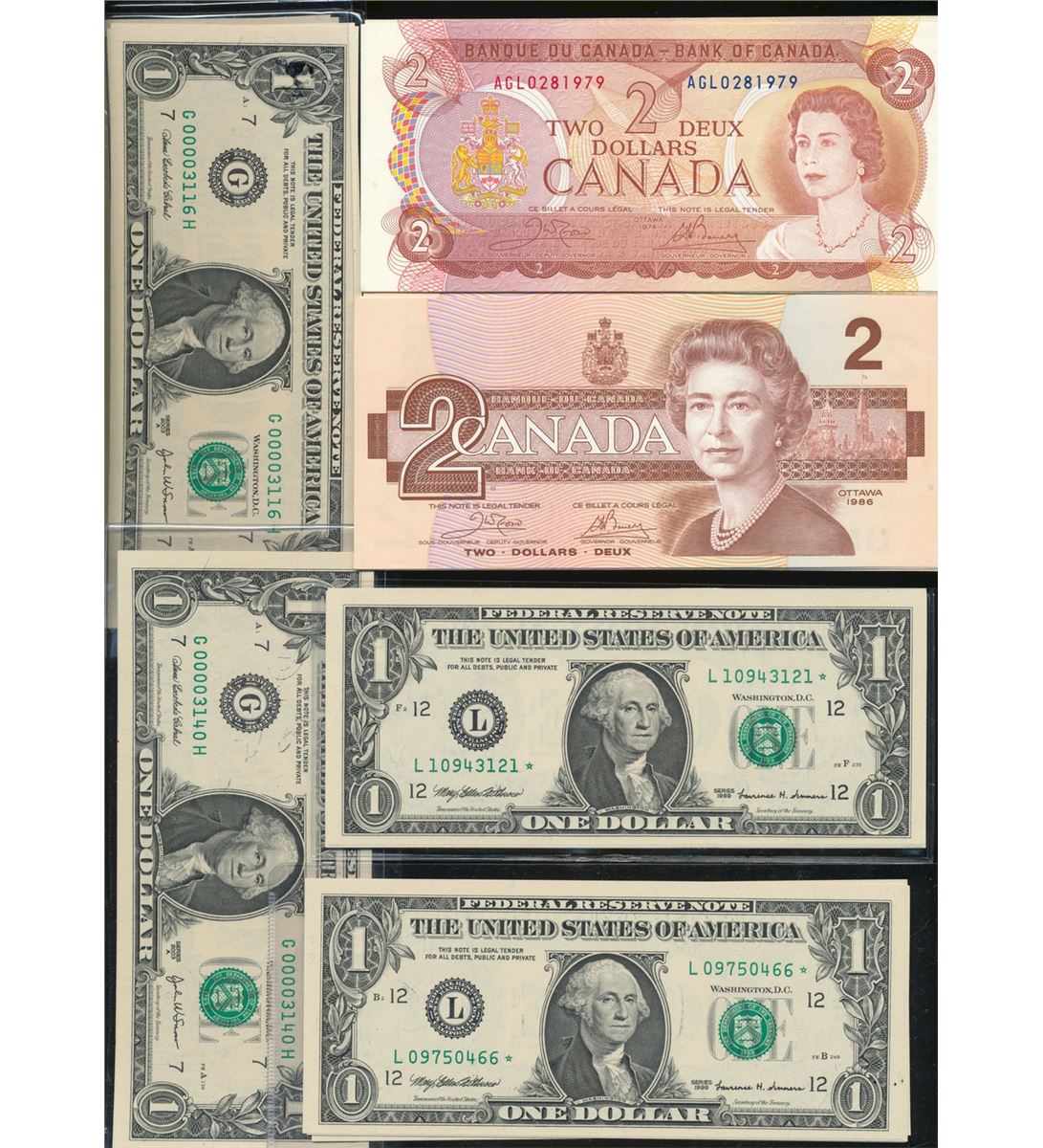 Banknote Lot; 1974 $2(5), 1986 $2(10), USA 1999 $1(10) replacement issues & 2003(6) low serial number issues. US includes consecutive runs. Canada notes EF to UNC and USA all Crisp UNC issues.