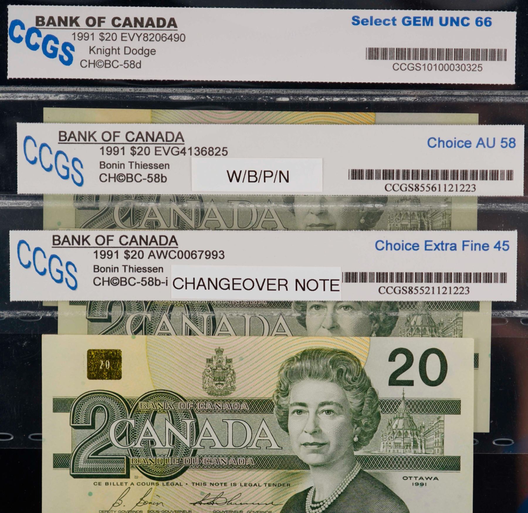 Banknote Lot - 1991 $20; Includes various signatures, prefixes and grades. All 3 notes CCGS Choice Extra Fine-45 to Superb Gem Uncirculated-66