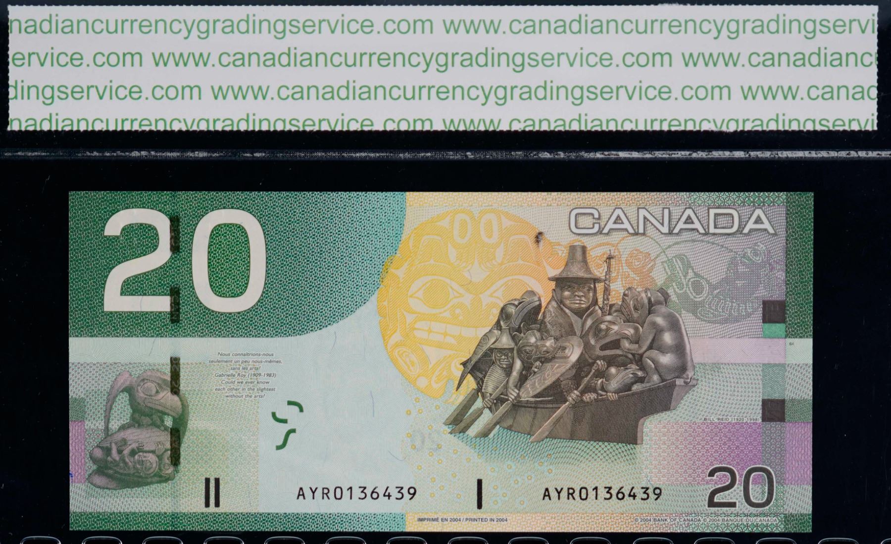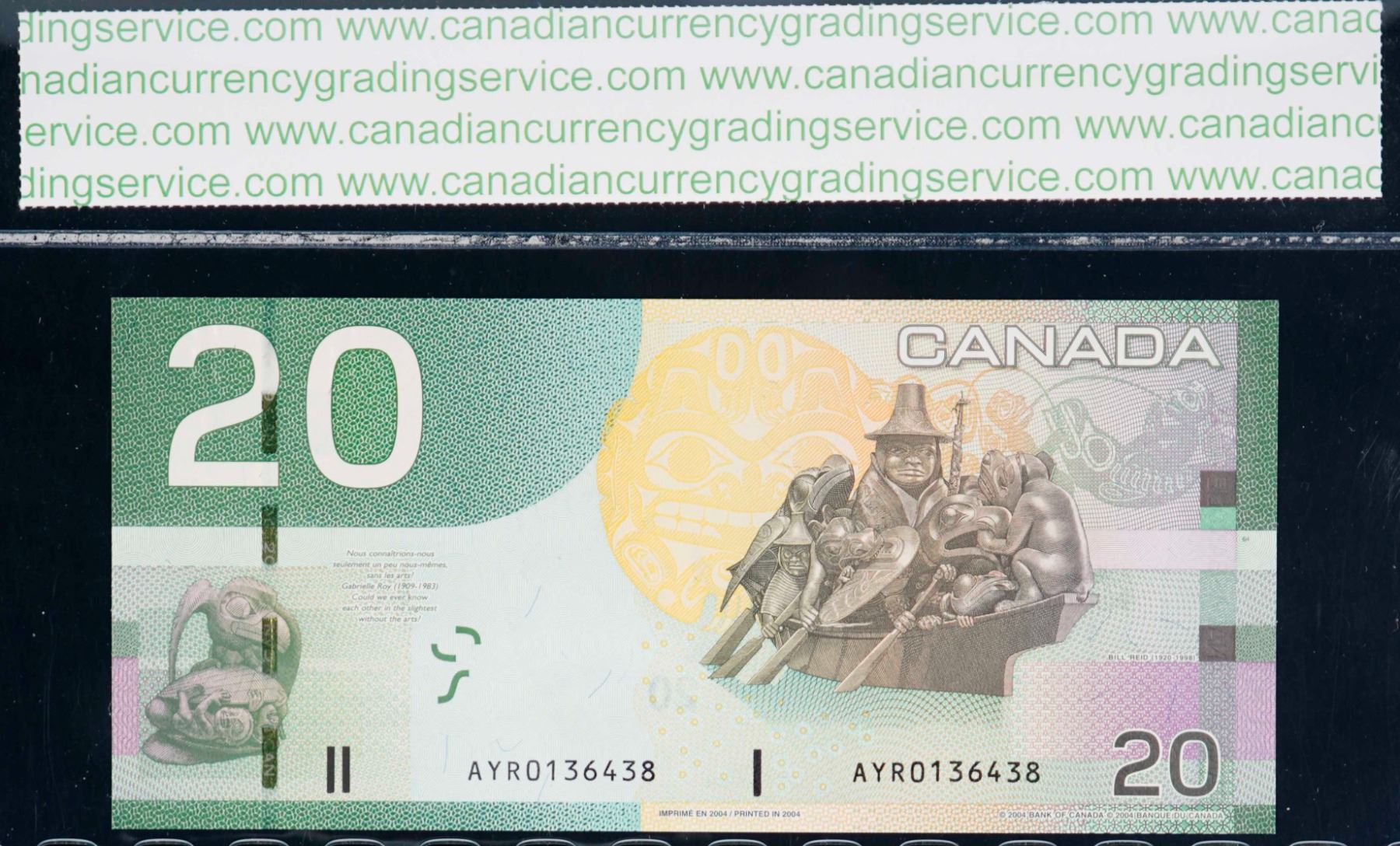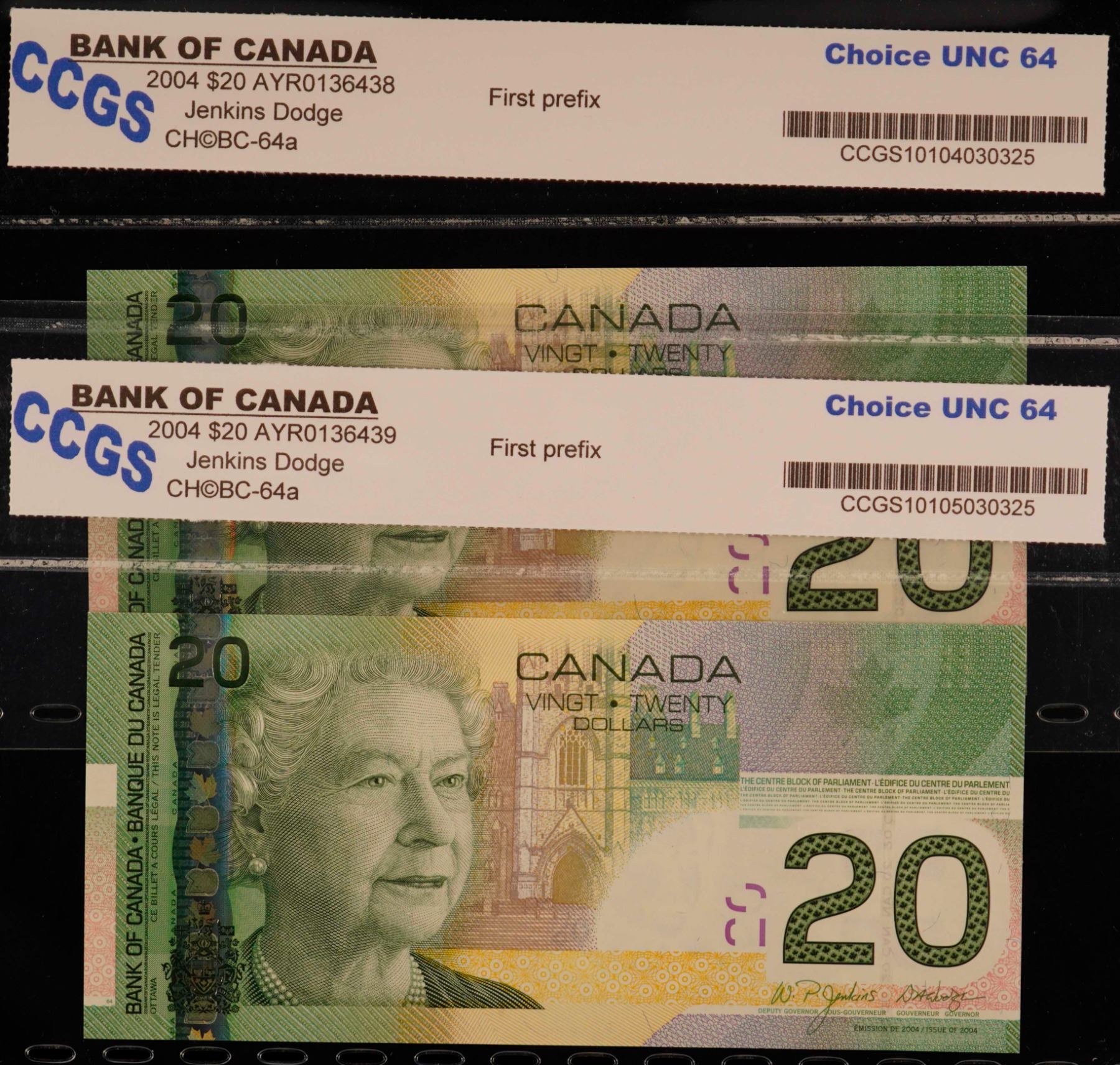 Banknote Lot -2004 $20; Includes various signatures, prefixes and grades. Both notes CCGS Choice Uncirculated-64. "First Prefix"