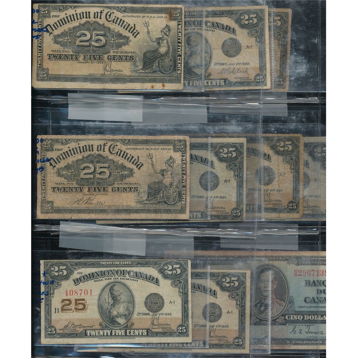 Banknote Lot; includes 1900 25¢ Shinlaster(2), 1923(7), 1937 $5 all Good to VG, 1954 Mod $1, $5, $