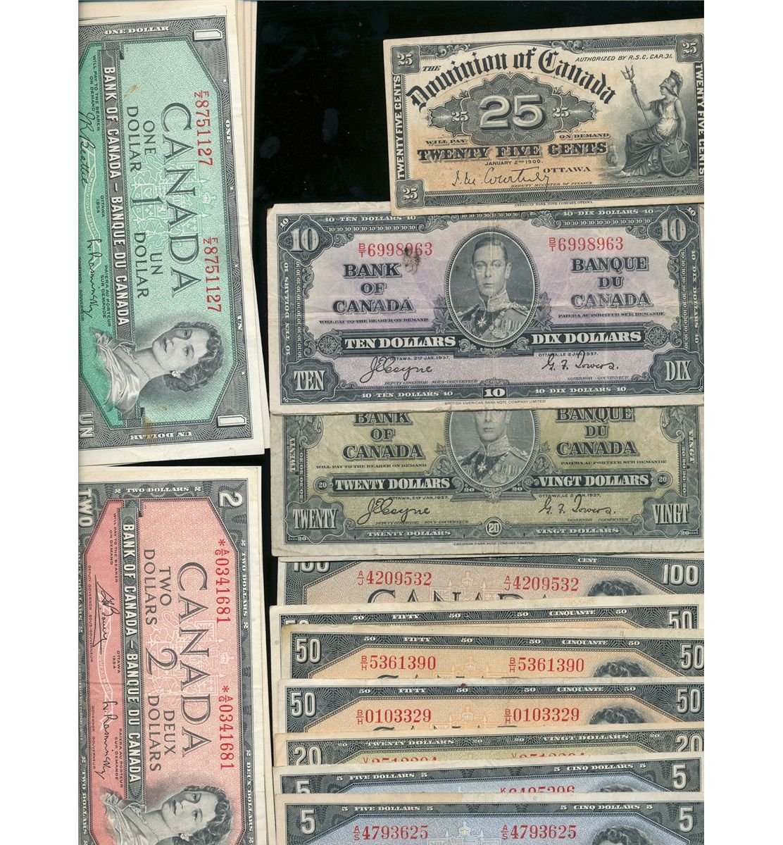 Banknote Lot; includes 1900 25¢ Shinplaster, 1937 $10, 1937 $20(2), 1954 $1(24), $2(12), $5(3), $20