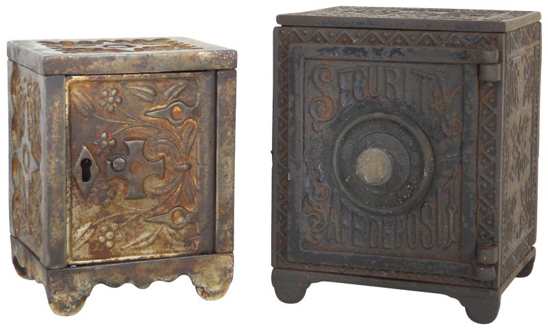 Banks (2), J&E Stevens cast iron safe, pat 1897 & Security Safe Deposit combination cast iron safe, patd 1888, both VG cond, 4" & 5"H.