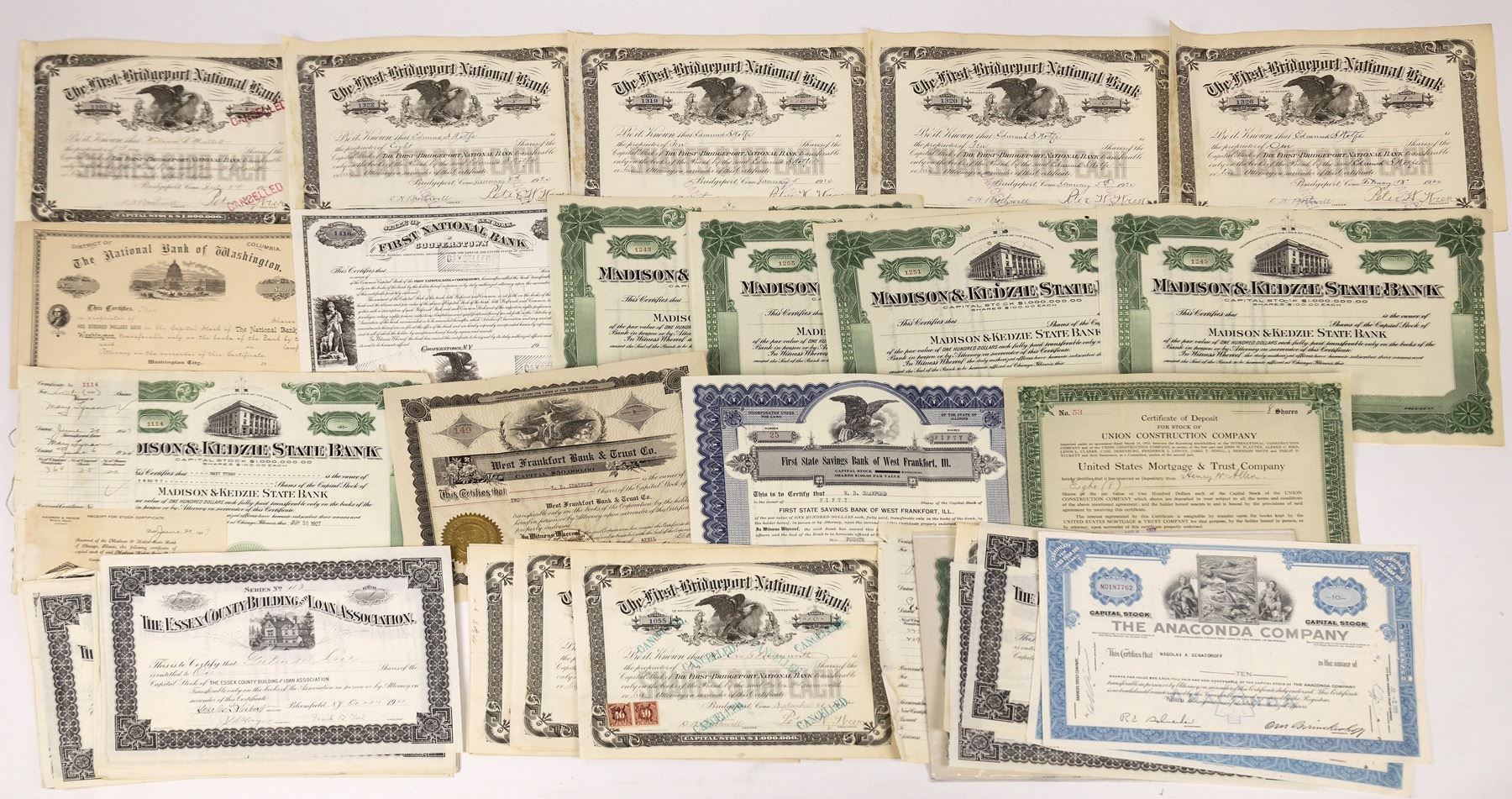 Approx. 60 bank stocks. About 30 Madison and Kedzie State Bank, unissued, about 8 issued 1927.7 First Bridgeport National 1915-16. Security State Bank of Havre 1913. About 30 Essex County Building and Loan 1911-12. And more. City: State: Date:
