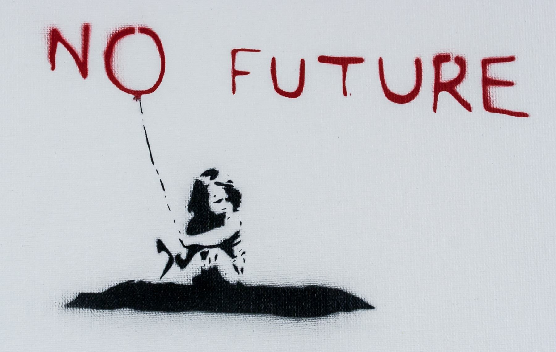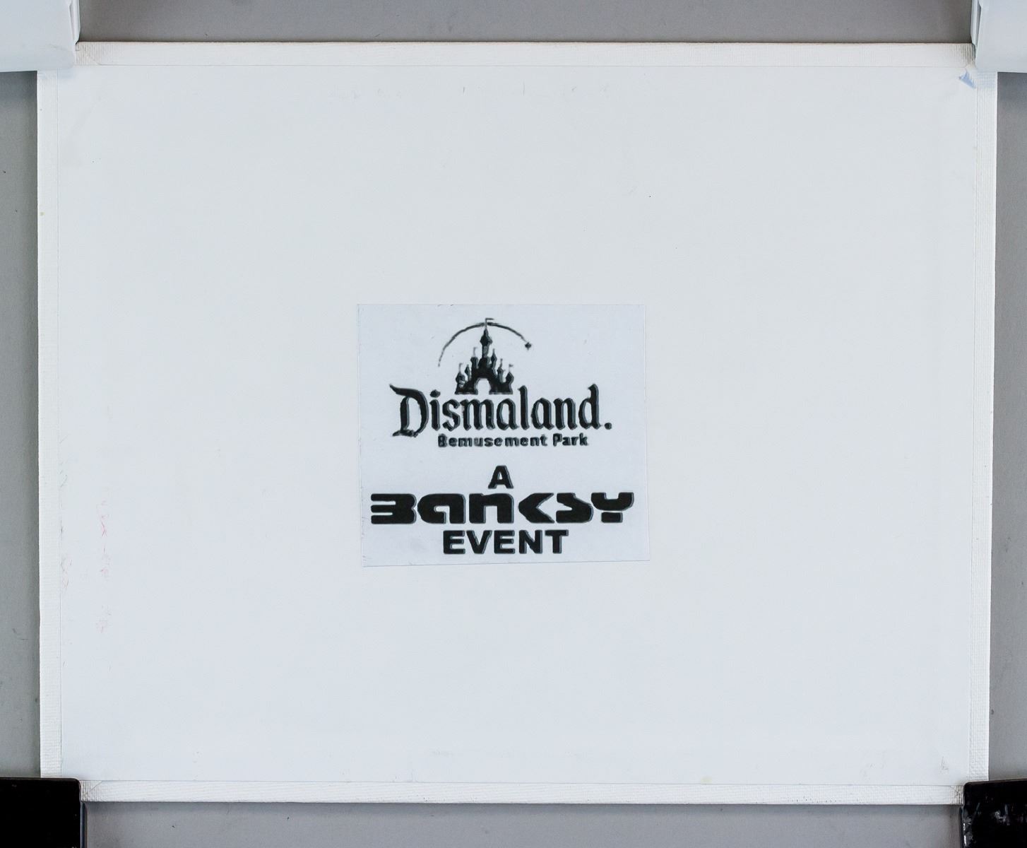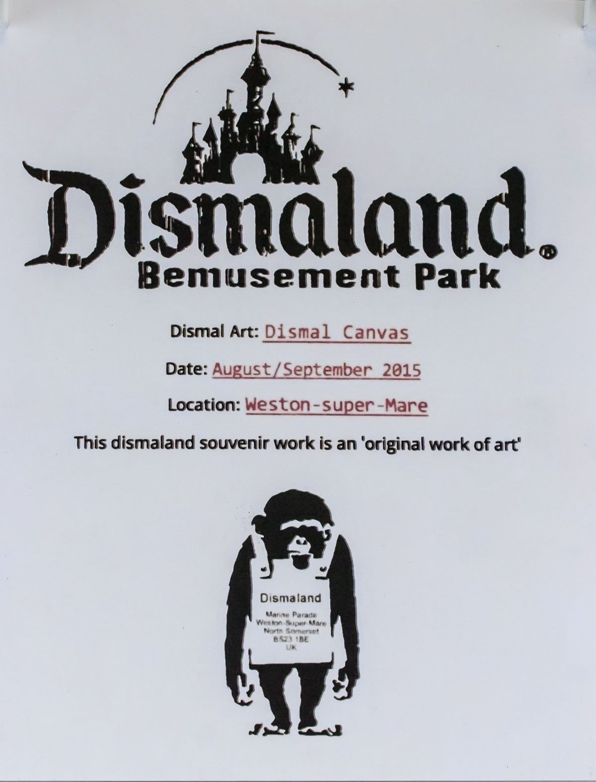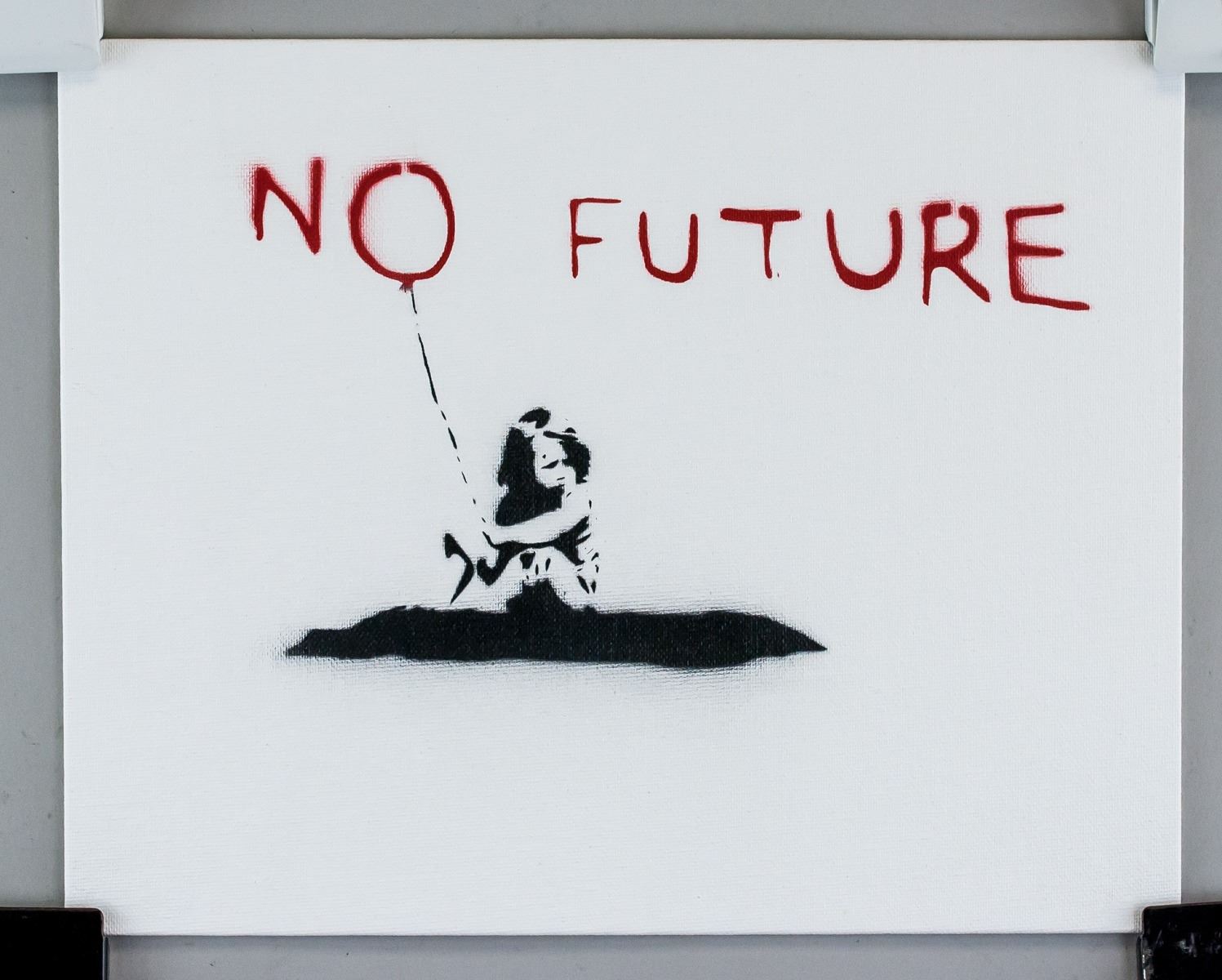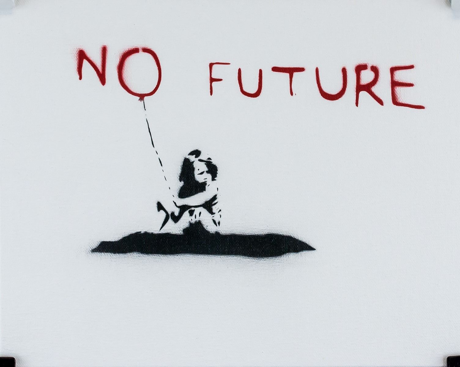 Spray on canvas. Featuring a figure holding aloft NO FUTURE. Stamped on verso DISMALAND: Bemusement Park A BANKSY EVENT. Accompanied with card inscribed Dismal Art: Dismal Canvas / Date: August / September 2015 / Location: Weston-super-Mare / This dismaland souvenir work is an 'original work of art'. Attributed to Banksy (born 1974, British). 25.5 x 20.5 cm (10 x 8 in). Provenance: This lot carries limited provenance from an Upper New York estate