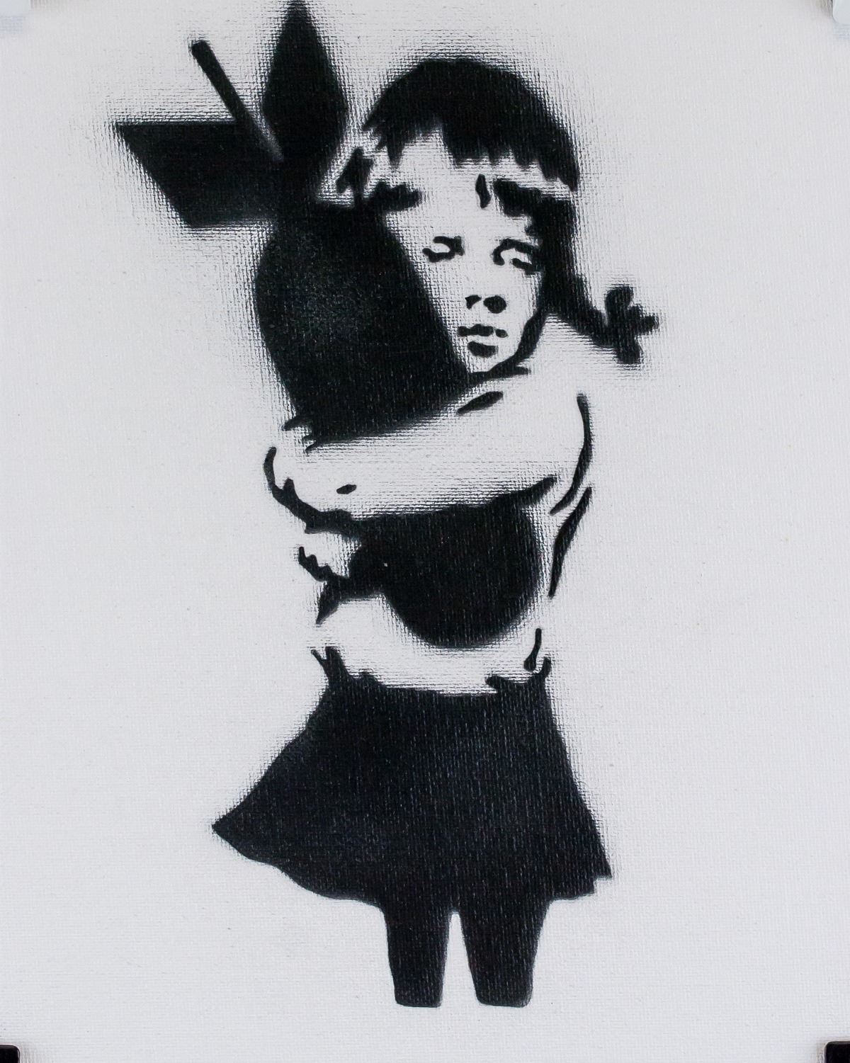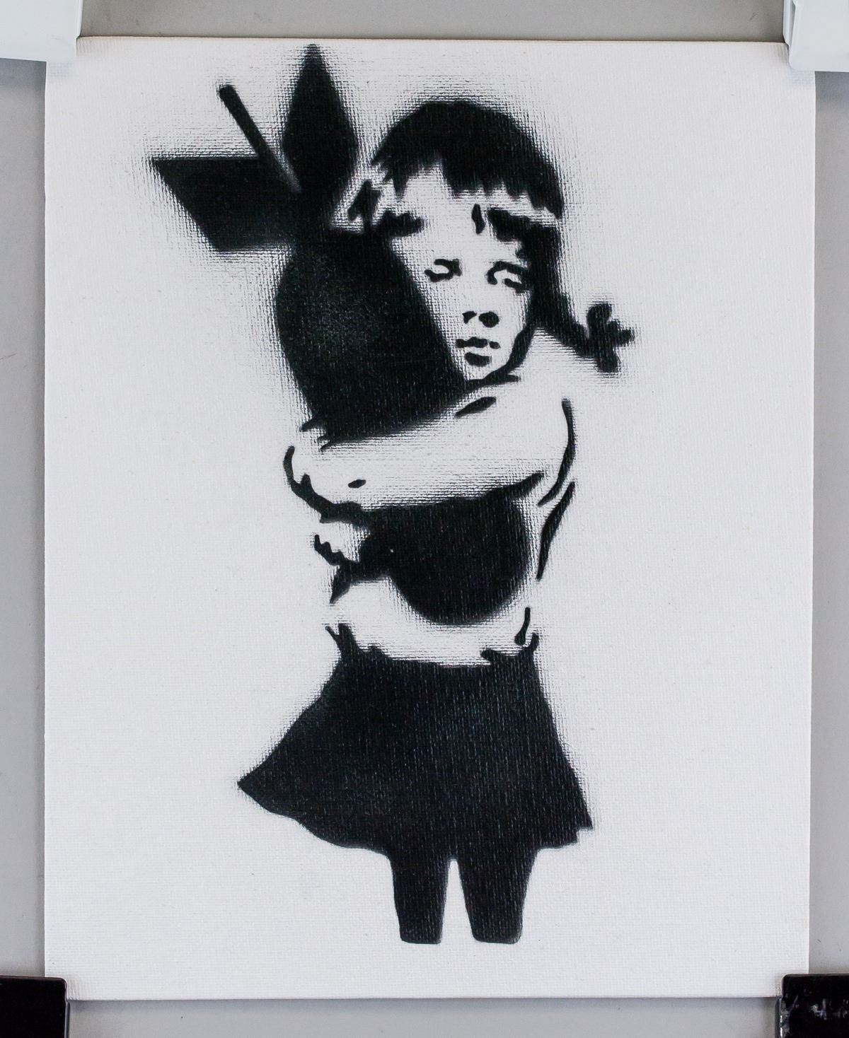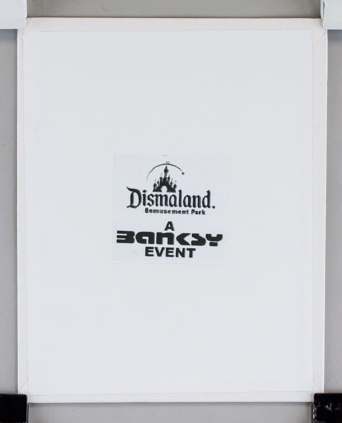 Spray on canvas. Featuring girl hugging a bomb. On verso, inscribed Dismaland. Bemusement Park A BANKSY EVENT. Accompanied with card inscribed Dismal Art: Dismal Canvas / Date: August / September 2015 / Location: Weston-super-Mare / This dismaland souvenir work is an 'original work of art'. Attributed to Banksy (born 1974, British). 25.5 x 20.5 cm (10 x 8 in). Provenance: This lot carries limited provenance from an Upper New York estate