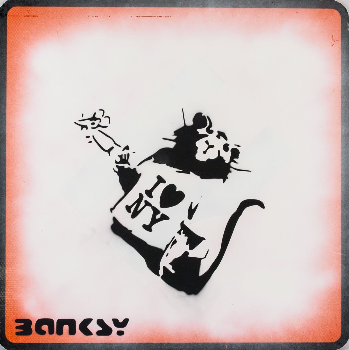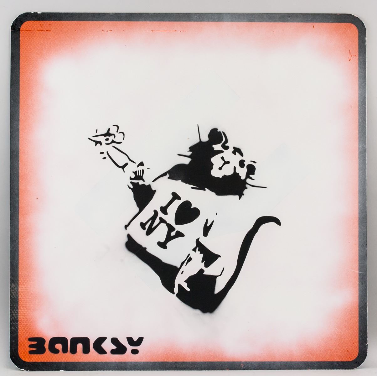 Reflective sign. Featuring painted rat wearing I (heart) NY t-shirt. Inscribed BANKSY on the lower left corner. Attributed to Banksy (born 1974, British). 60 x 60 cm (23.5 x 23.5 inches). PROVENANCE: This lot carries limited provenance from a Private British estate