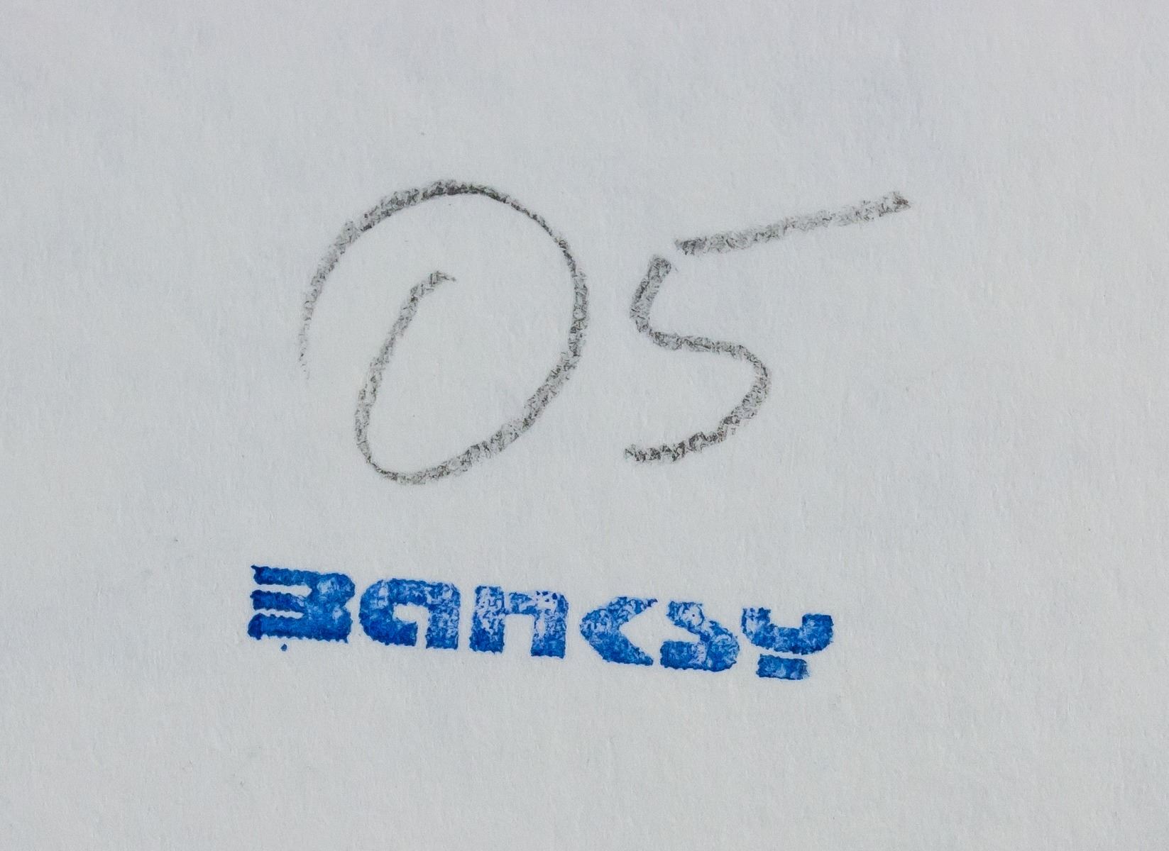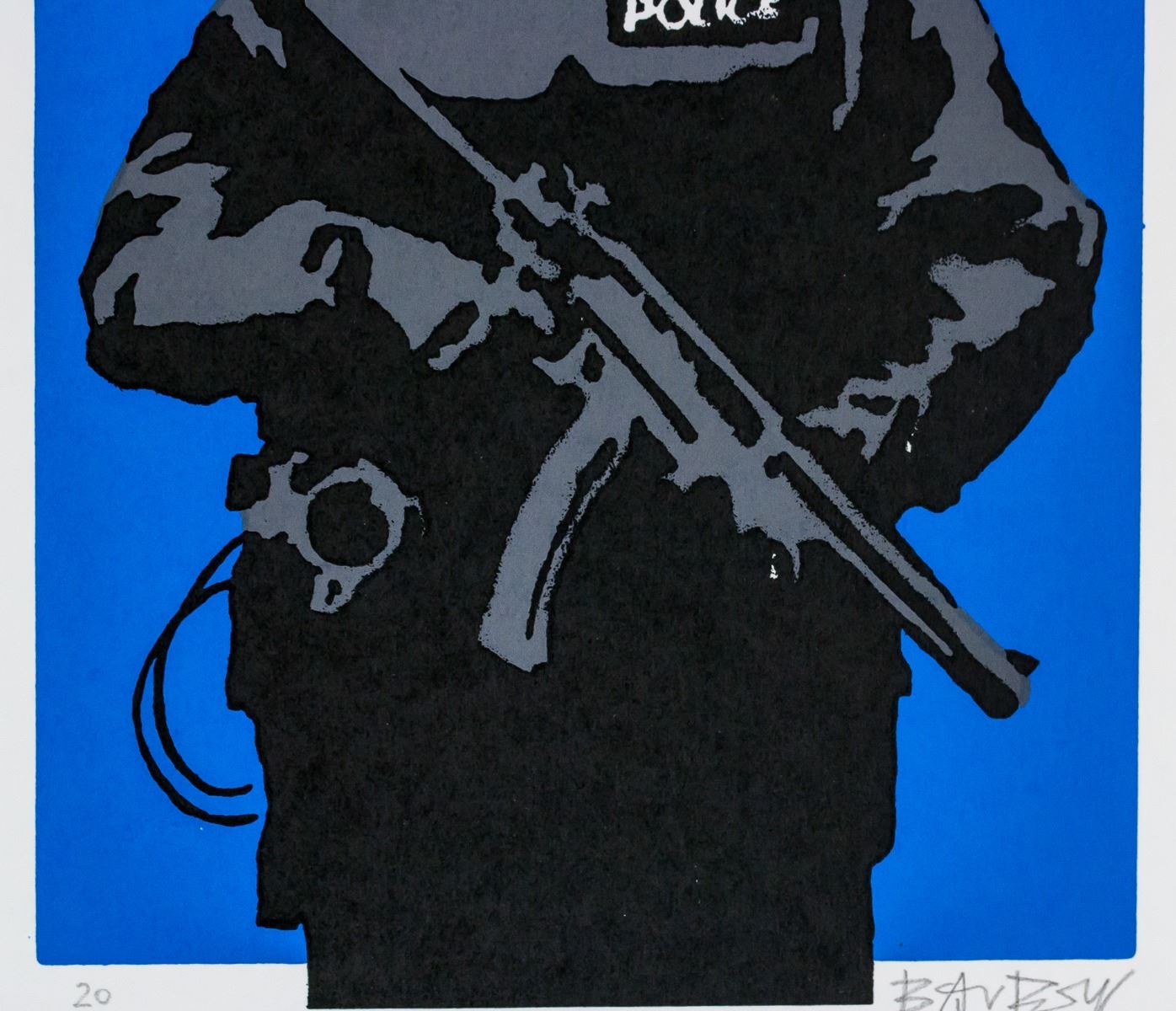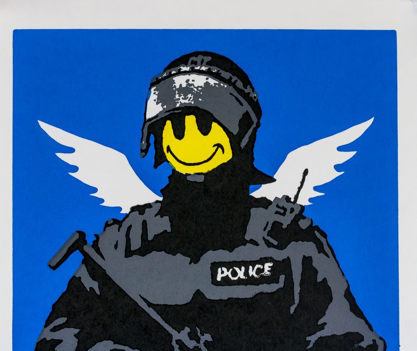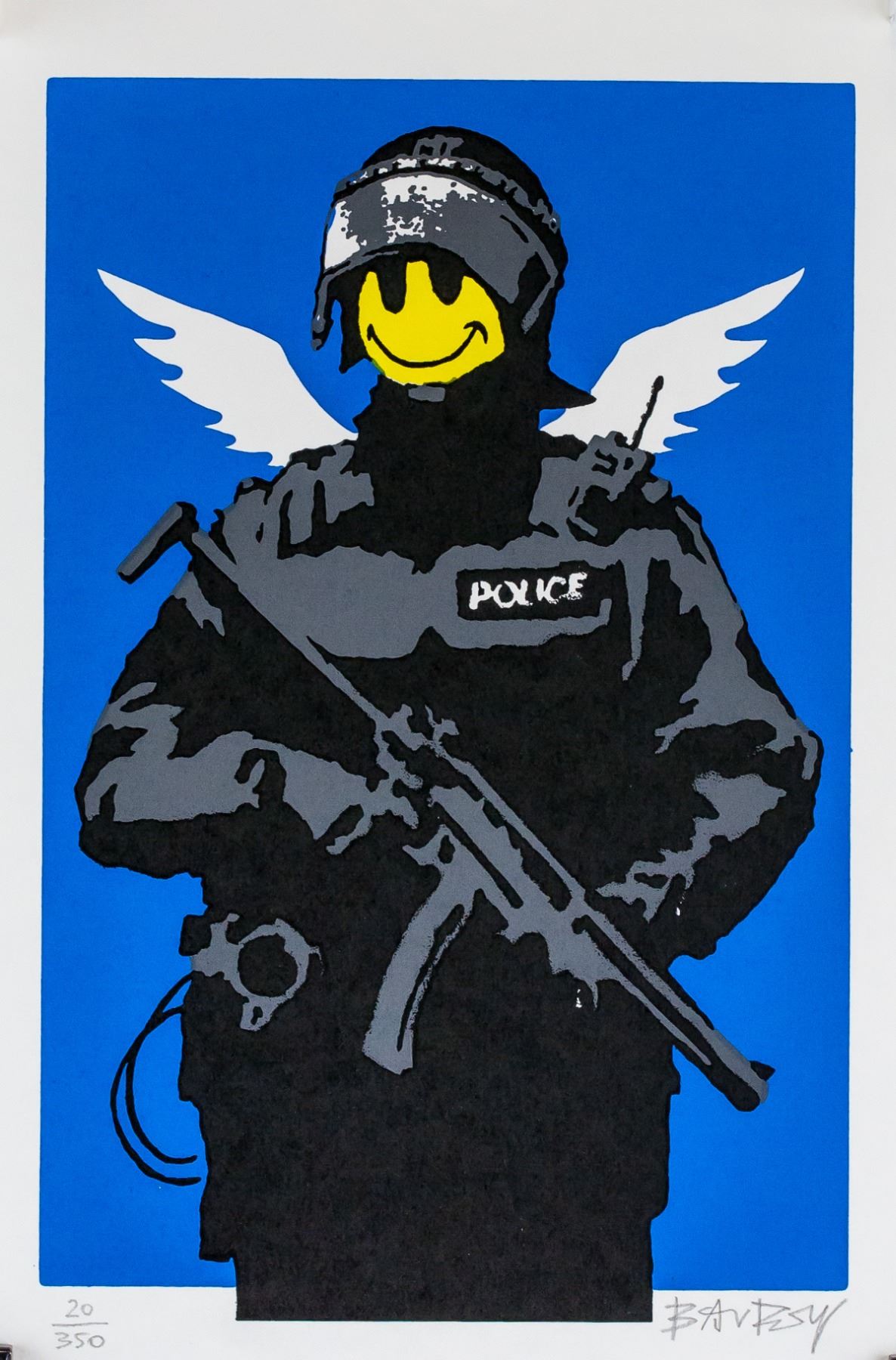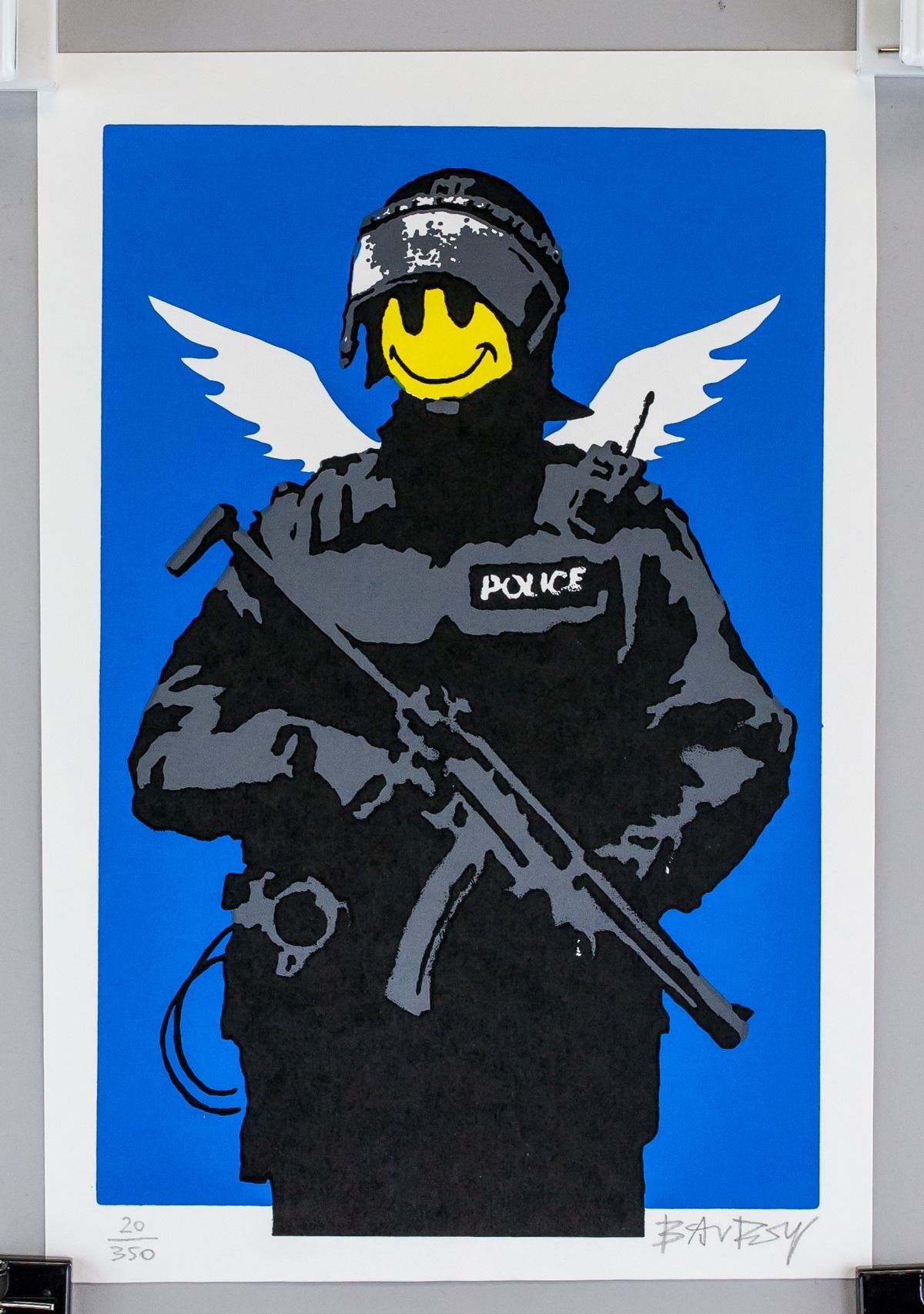 Lithograph on paper. Featuring a member of SWAT team with happy face and angel wings. Signed Banksy and inscribed 20/350 on the lower right and lower left corner, respectively. Inscribed 05 and stamped BANKSY underneath, verso. Attributed to Banksy (born 1974, British). 29.5 x 20 cm (11.5 x 8.0 inches). Provenance: This lot carries limited provenance from a Southern Ontario estate