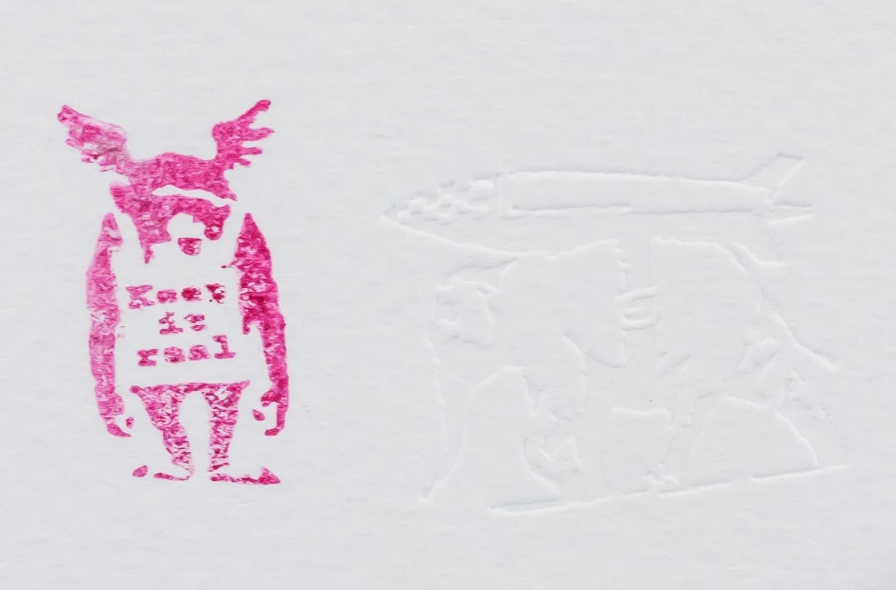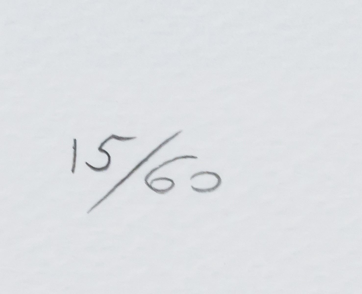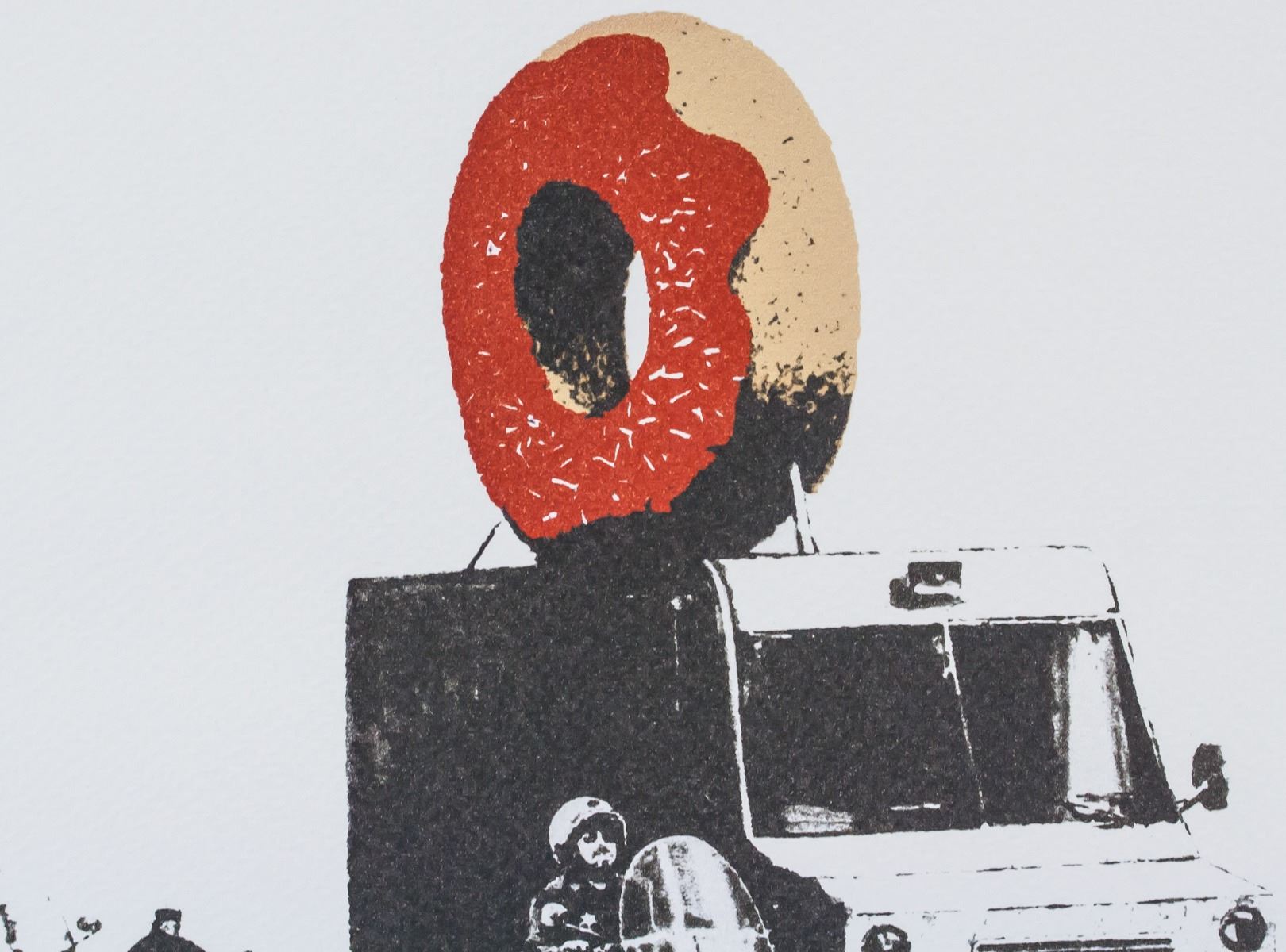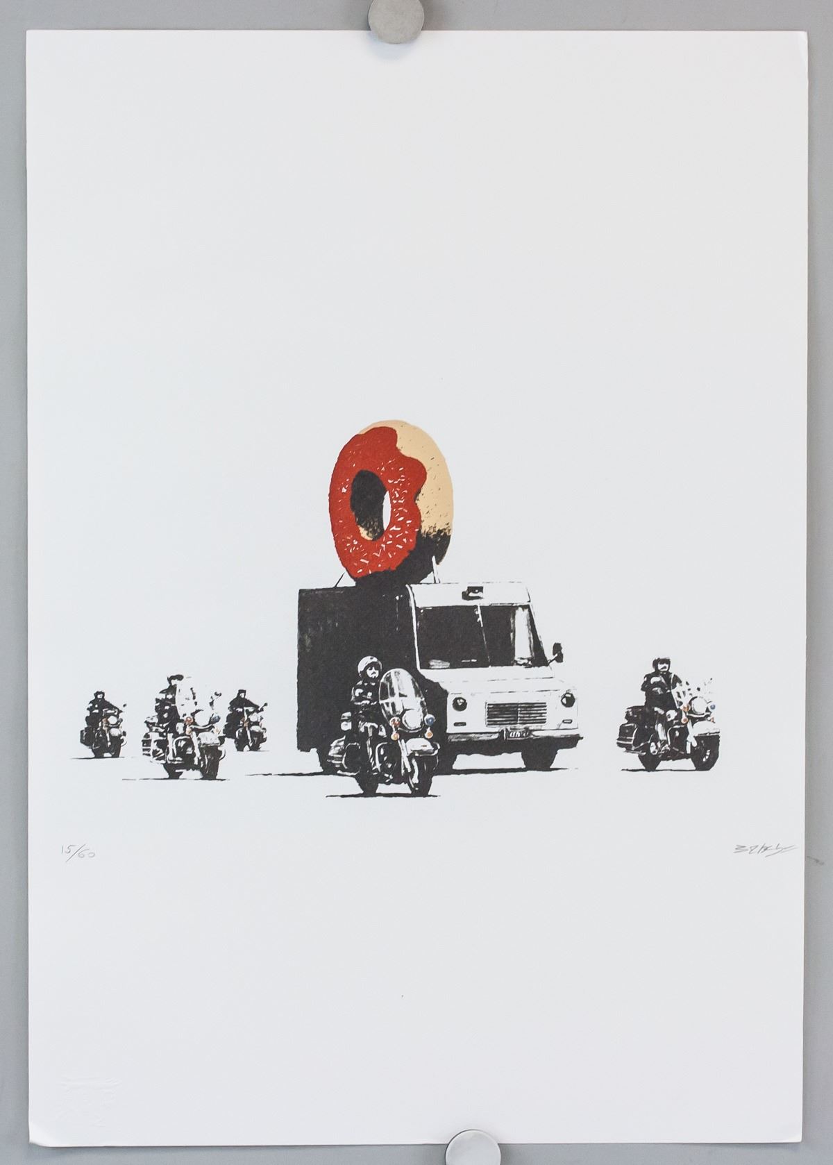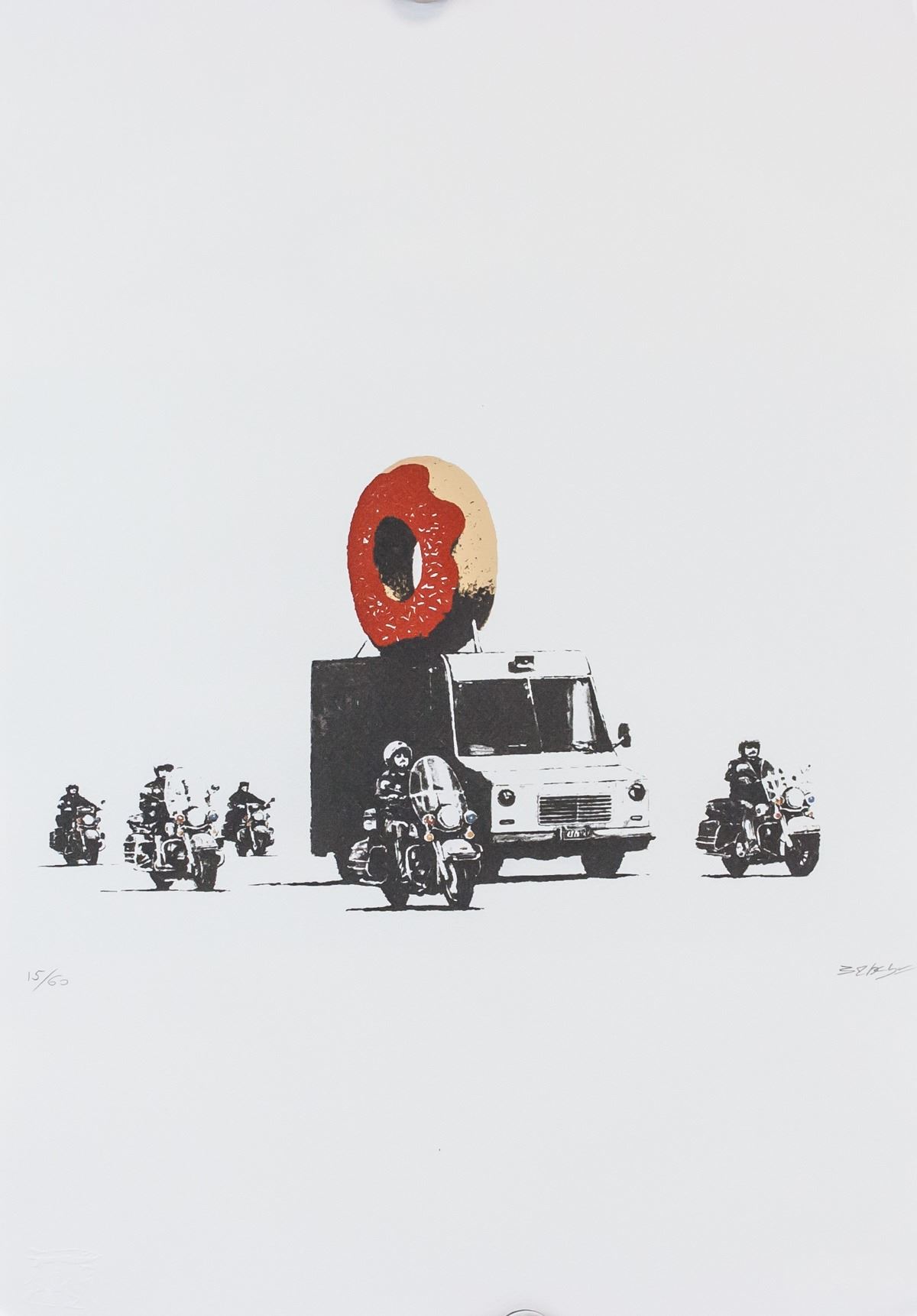 Lithograph on paper. Featuring a food truck with Nike emblem and oversized donut being escorted by police motorcade. Signed Banksy and inscribed 15/60 on the lower right and lower left corner, respectively. Embossed seal and stamped on verso. Attributed to Banksy (1974- , British). 51 x 35 cm (20 x 13.75 inches). Provenance: This lot carries limited provenance from a Southern Ontario estate