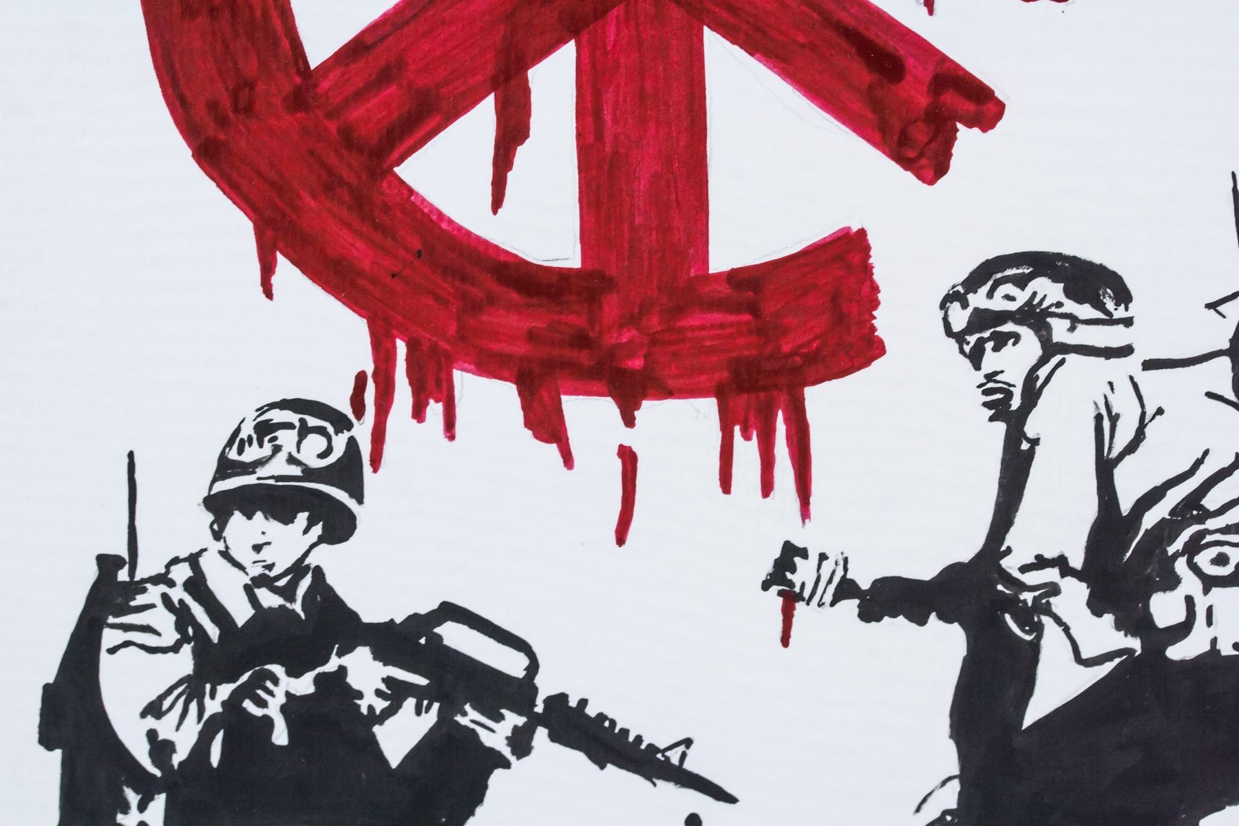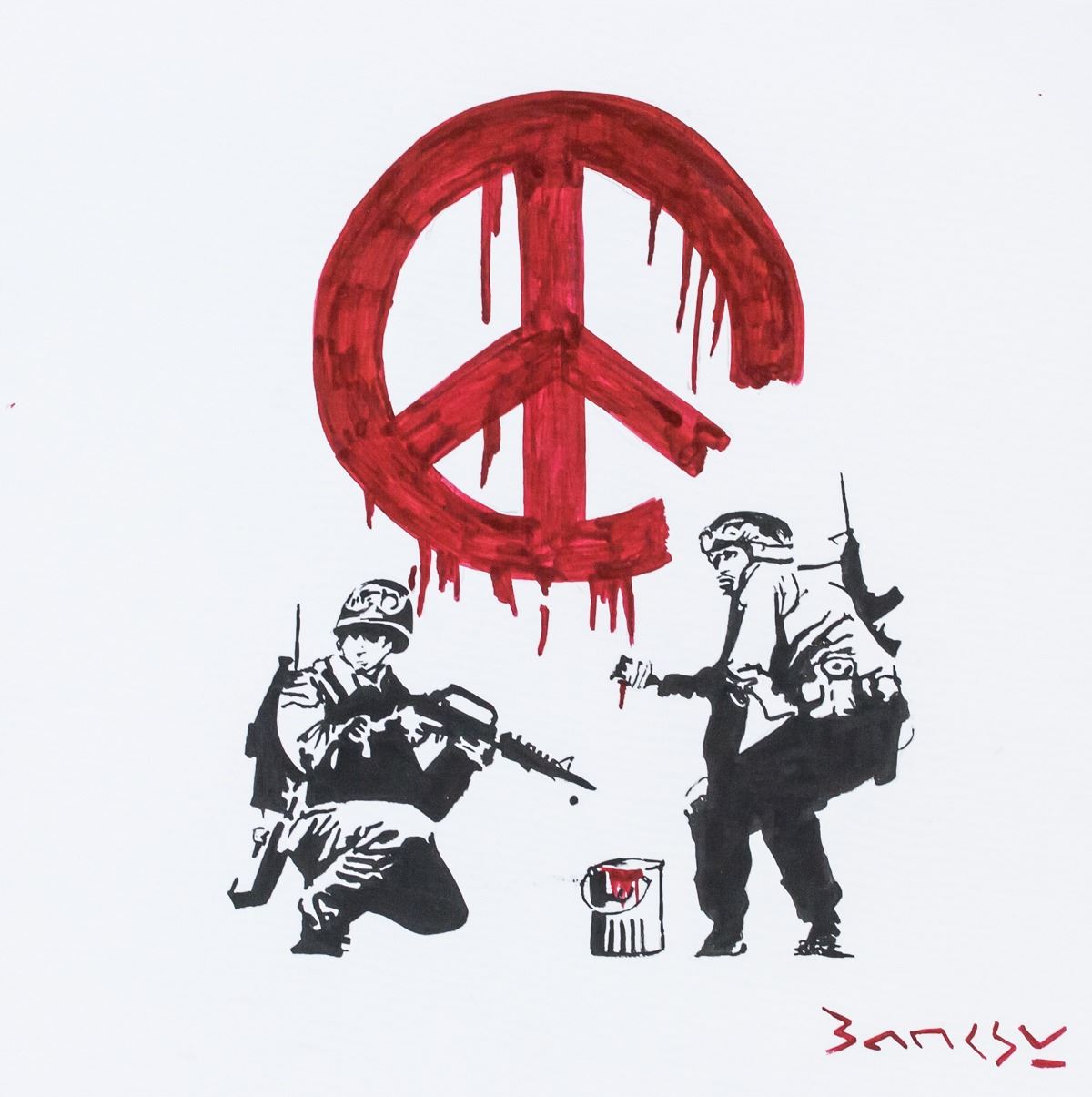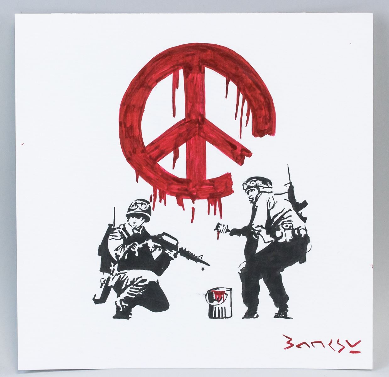 Spray paint on paper. Featuring two soldiers painting a dripping red peace sign. Signed "BANKSY" in the bottom right corner. Attributed to Banksy (1974- . British). 30.5 x 30.5 cm (12 x 12 inches). Provenance: This lot carries limited provenance from a Private Toronto collection