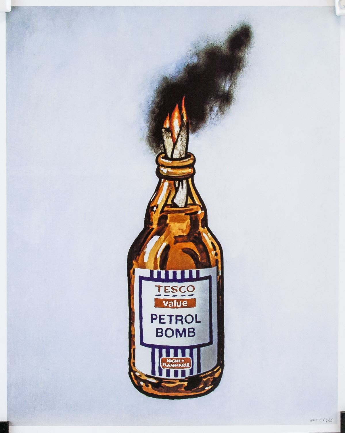 Print on paper. Featuring image of a molotov cocktail. The label on the bottle reads "TESCO value PETROL BOMB HIGHLY FLAMMABLE". "BANKSY" printed in the bottom right corner. Attributed to Banksy (1974- , British). 50 x 40 cm. PROVENANCE: This lot carries limited provenance from a Private American collection (California)