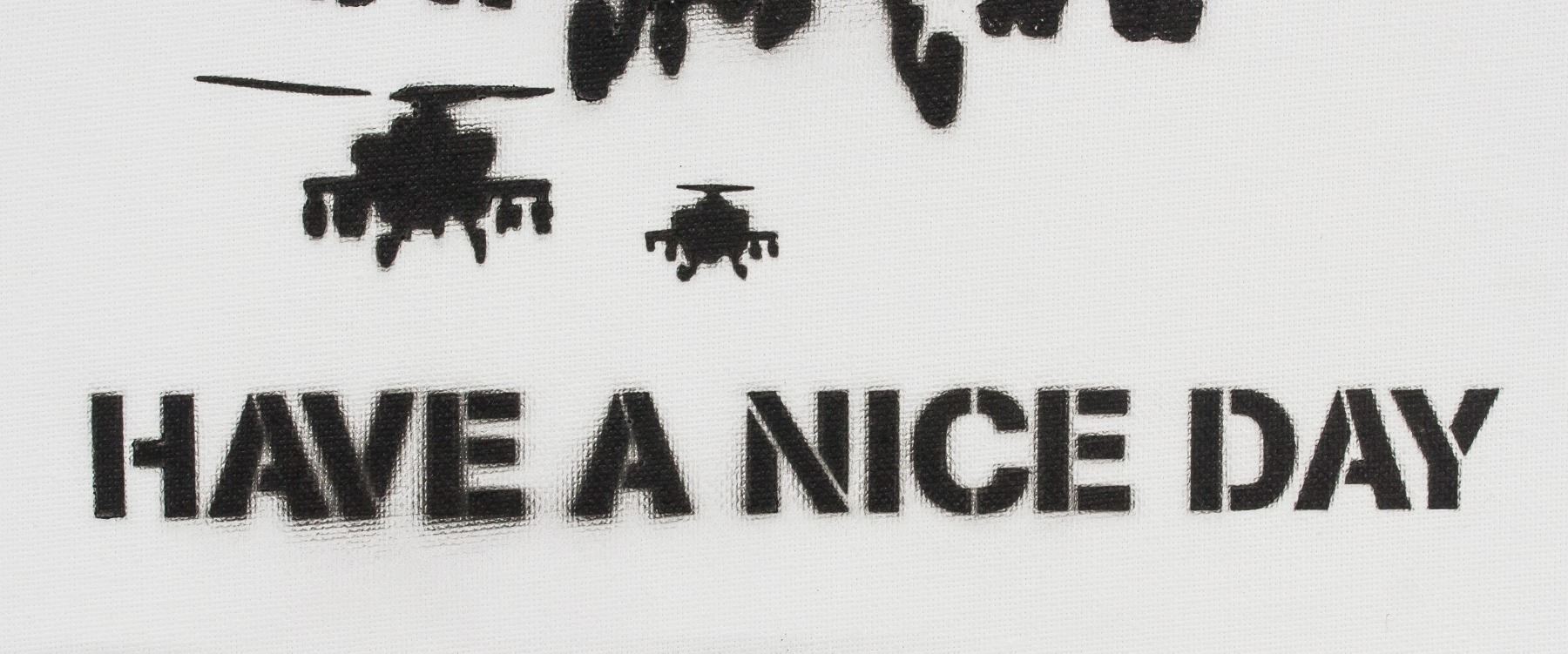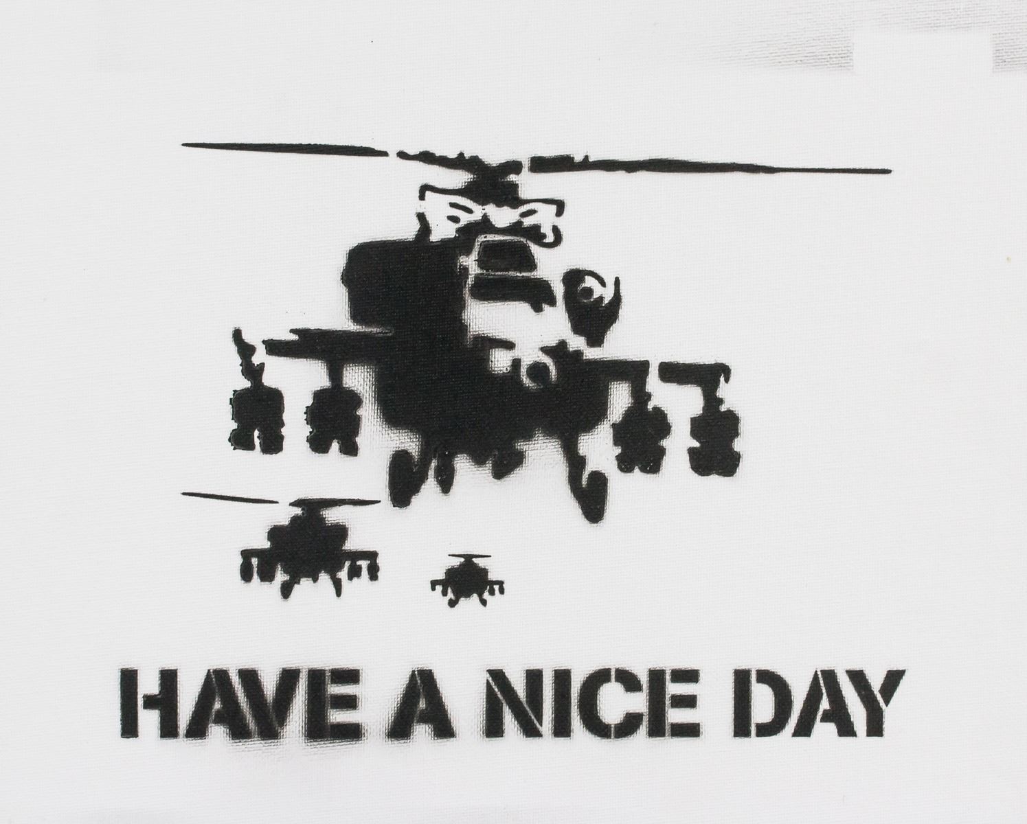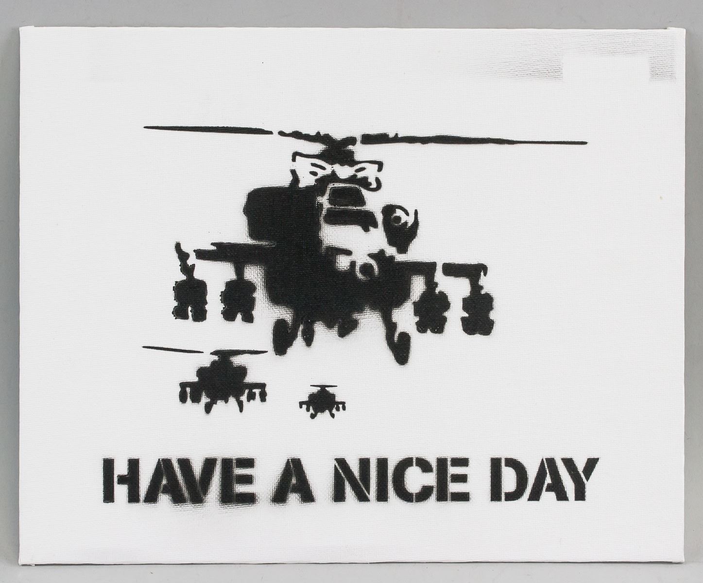 Spraypaint on canvas board. Featuring a helicoptor and inscribed HAVE A NICE DAY. Verso with label inscribed Dismaland Bemusement Park / A BANKSY EVENT. Attributed to Banks (1974, - British). 25 x 30 cm (9.5 x 12 inches). Provenance: This lot carries limited provenance from an Upper New York estate