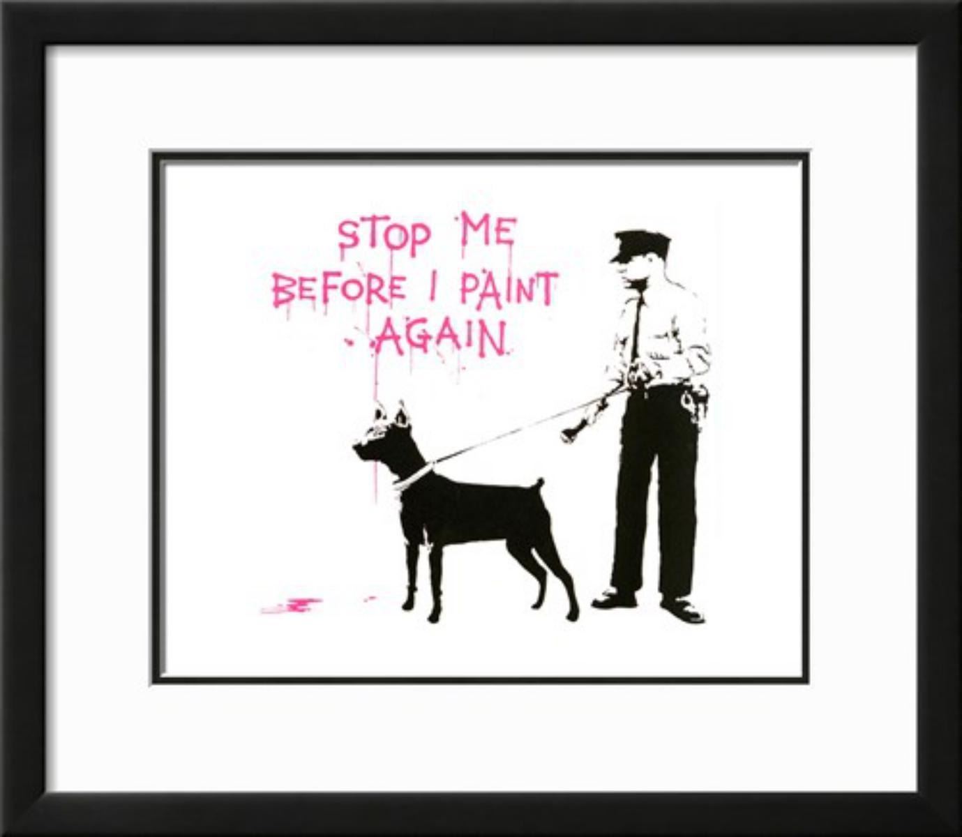Artist: Banksy. Title: "Stop me before I paint again". Medium: Offset Lithograph. Size: 21 x 18.5 inch