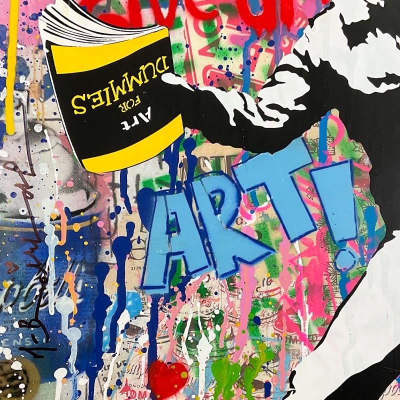 "Banksy Thrower" is a mixed media original on deckle edge paper by Mr. Brainwash, hand signed and bearing the thumbprint of the artist inverso. This piece comes custom framed. Includes Certificate of Authenticity. Measures approx. 26" x 26" (frame), 22" x 22" (image).