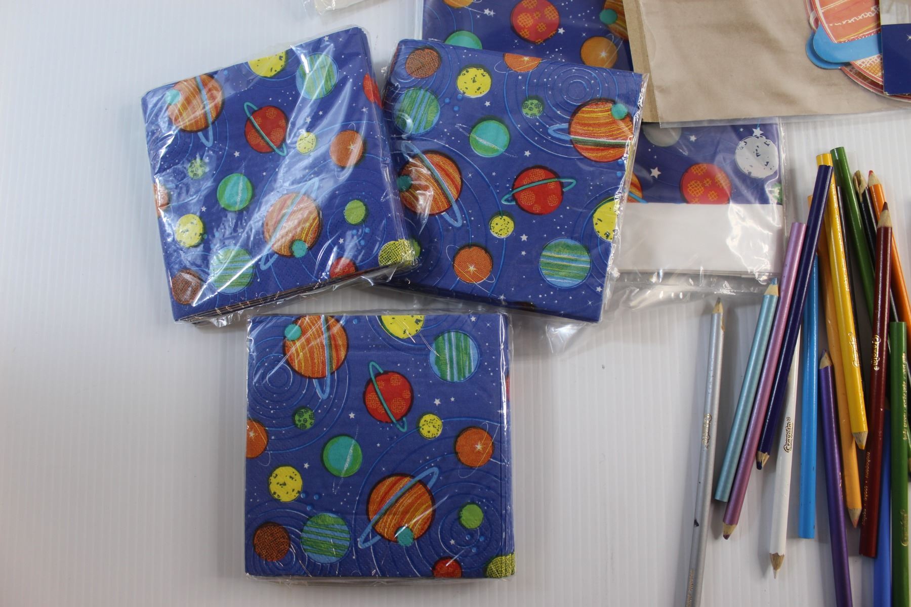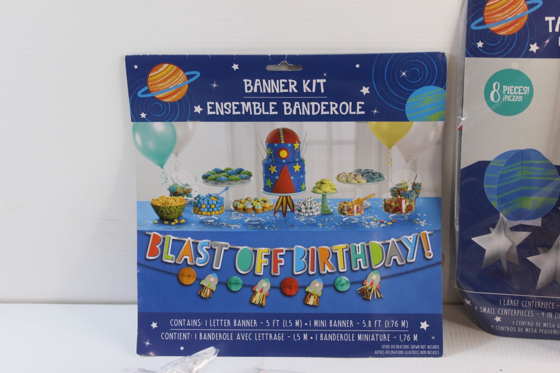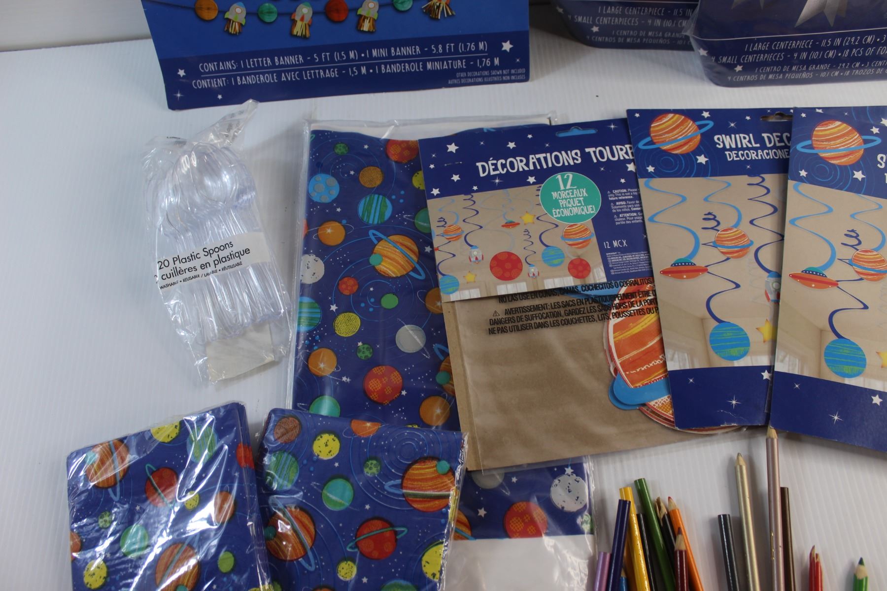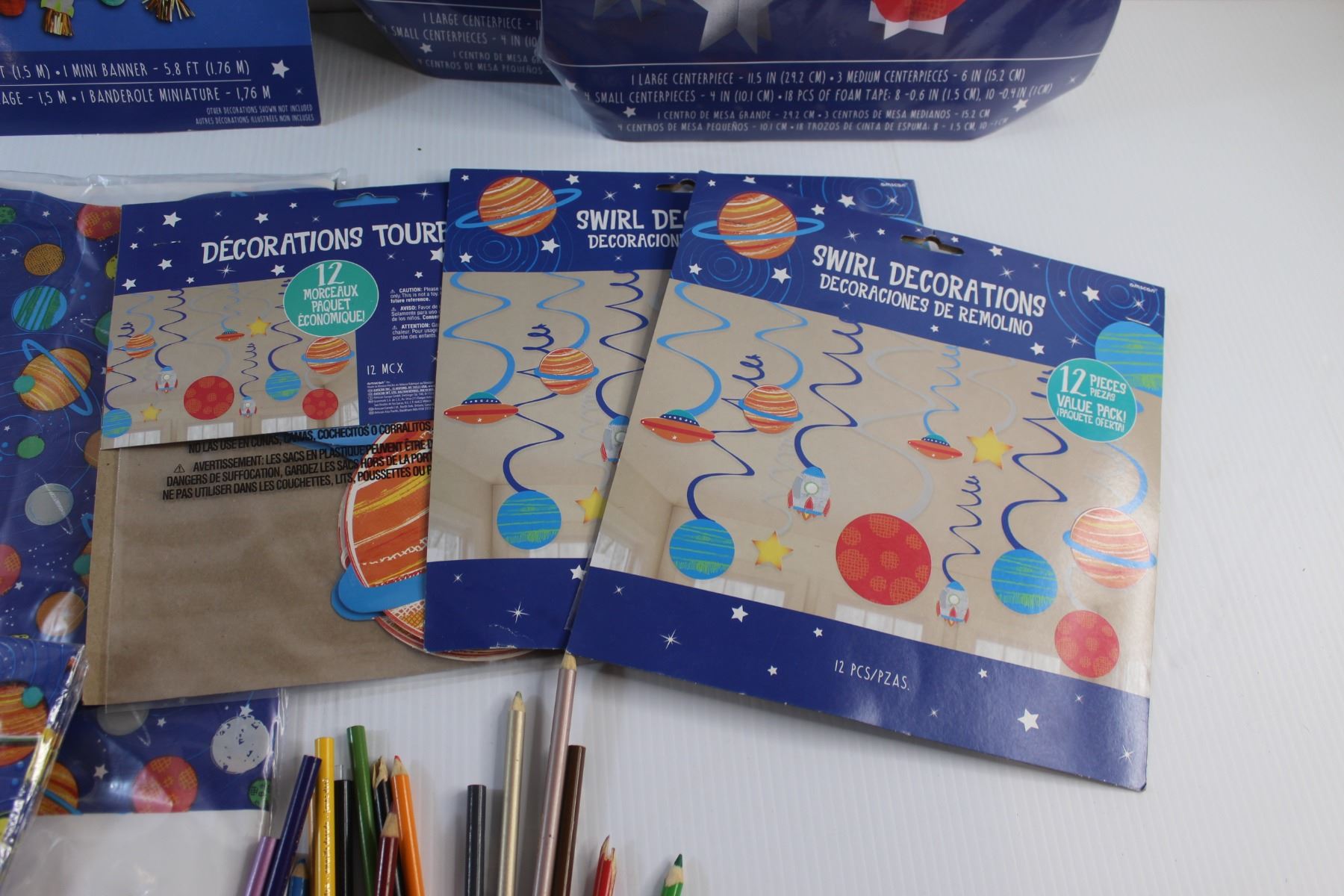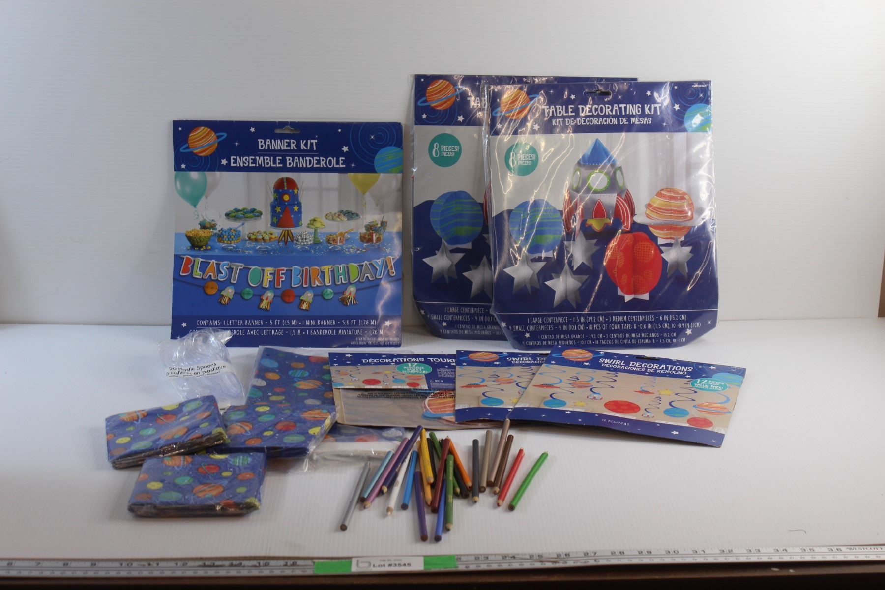 Banner Kit, Table Decoration Kits, Swirl Decorations, Napkins, Plastic Spoons and Colored Pencils