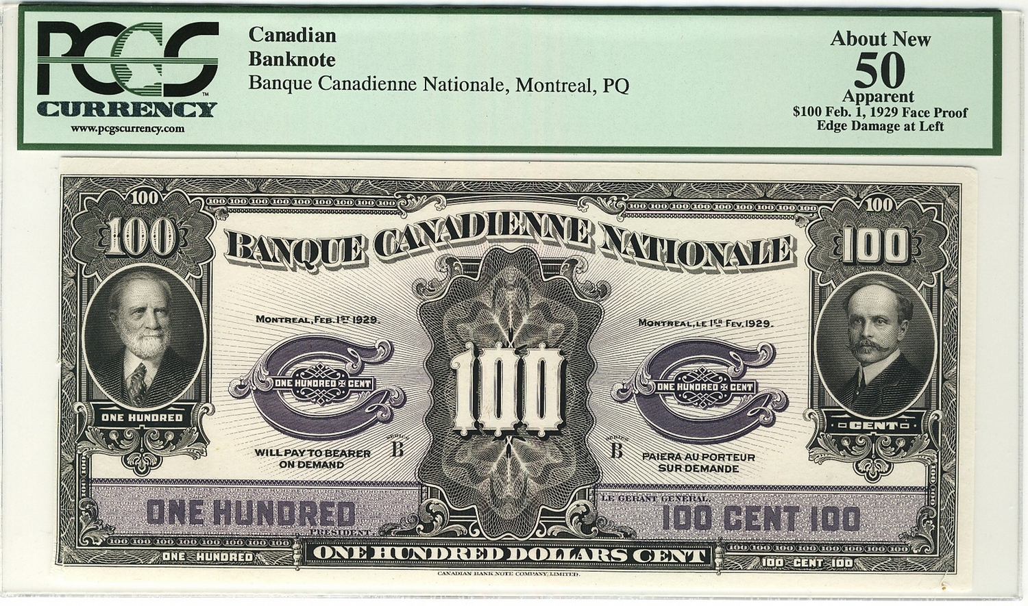 Banque Canadienne Nationale 1925 $100 034875 CH-85-10-10 PMG VF25