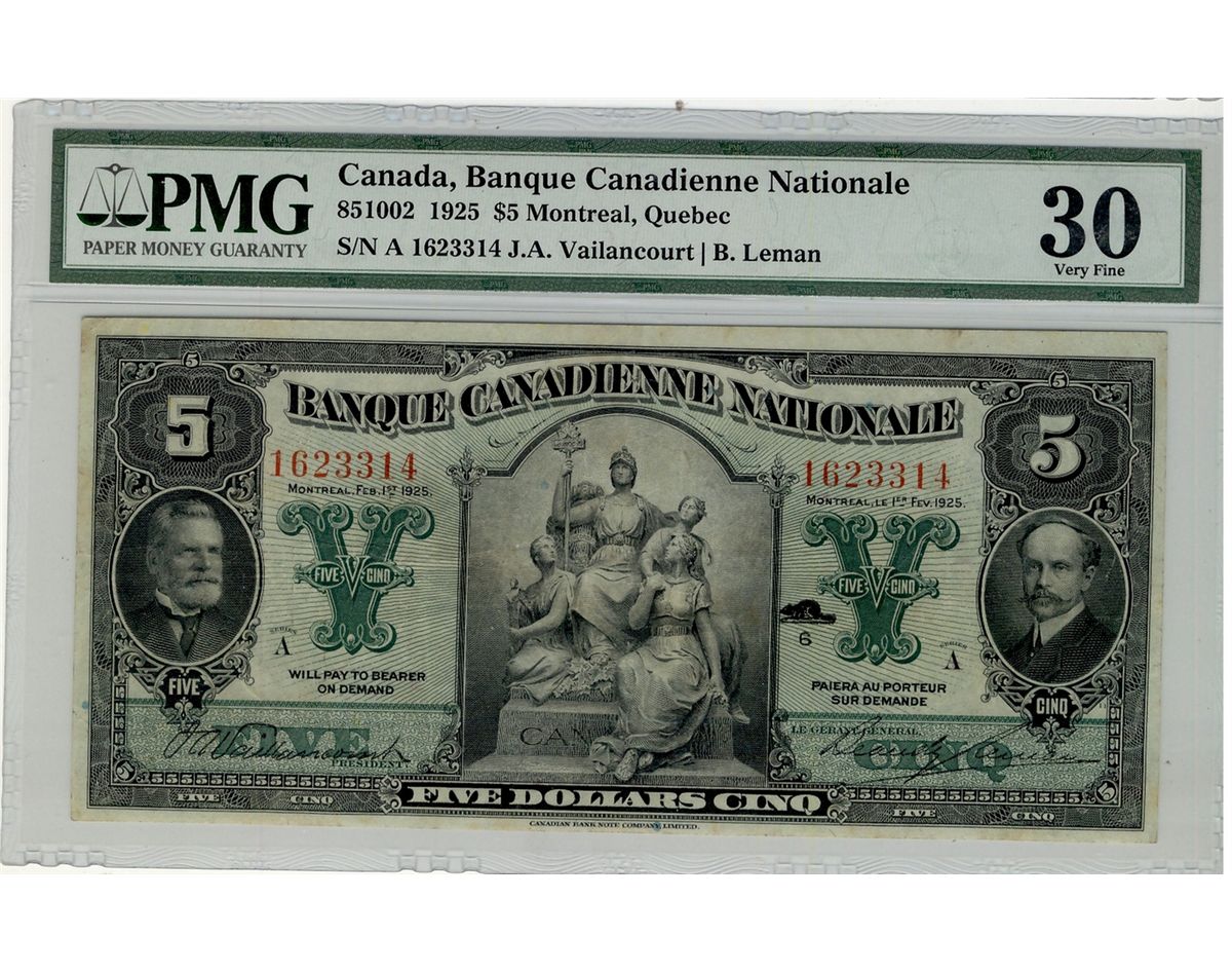 Banque Canadienne Nationale; 1925 $5 #1623314 CH-85-10-02 PMG VF30. Nice issue for grade.