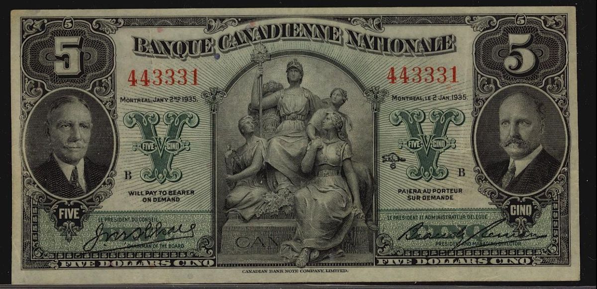 Banque Canadienne Nationale 1935 $5 #443331 CH-85-14-02. Clean and bright VF-EF.