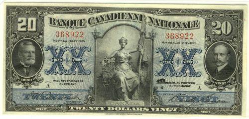 Banque Canadienne Nationale 85-10-06 1925 $20 EF+. Bright and attractive. Seldom seen that nice.