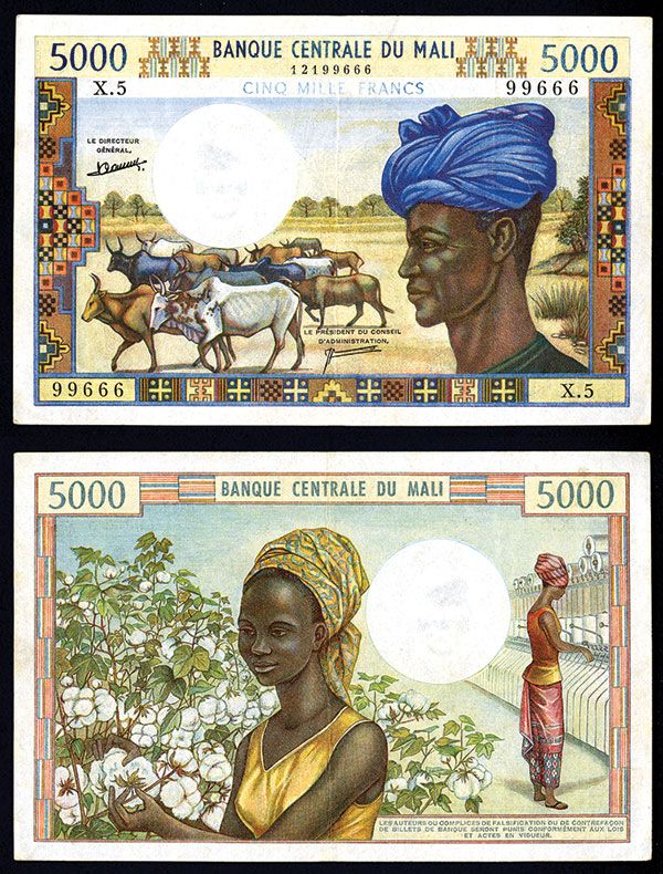 Mali, issued note, 5000 Francs, 1972-84, P-14d, PMG 35 Choice VF Splits, Foreign Substance.