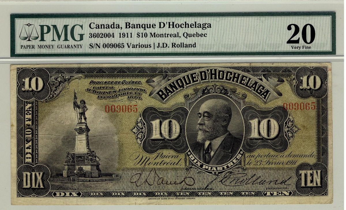 Banque D'Hochelaga, 1911 $10 #009065, CH-360-20-04, PMG VF20. Only 2 known. Best one seen and grade