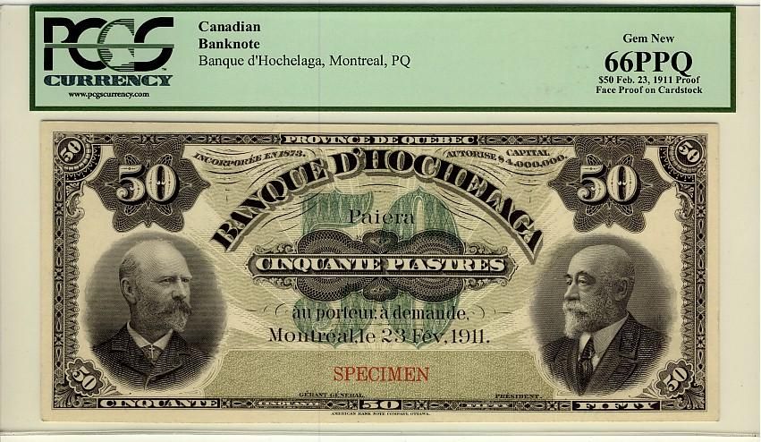 Banque D'Hochelaga, 1911 $50 SP Face Proof, CH-360-20-08Pa,PCGS UNC66 PPQ. Best example graded by PMG.
