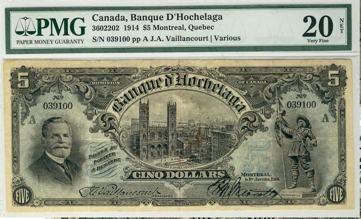 Banque D'Hochelaga, 1914 $5 #039100, CH-360-22-02 PMG VF20. An attractive issue. Only 21 notes known