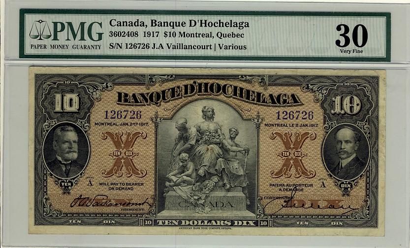 Banque D'Hochelaga, 1917 $10 #126726, CH-360-24-08, PMG VF30. Rare and finest graded by PMG.