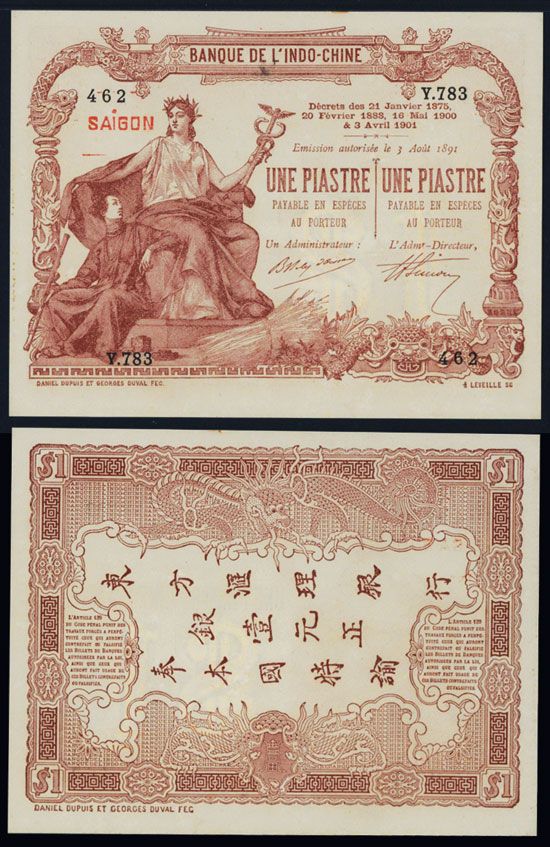 Saigon, French Indo-China, ND (ca.1909-21), 1 Piastre, P-34b, Asian woman seated below allegorical France, S/N 462-Y783, Brown on buff paper, PMG graded Choice Uncirculated 64, superb note that is only priced to XF in SCWPM. Rare note in this high of grade that will be difficult to improve upon.