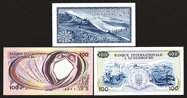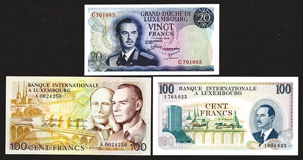 Luxembourg. 20, 100 Francs. P-14a, 14A, 54a. Grand Duc Jean on all. All are Choice Uncirculated. 3 pieces.