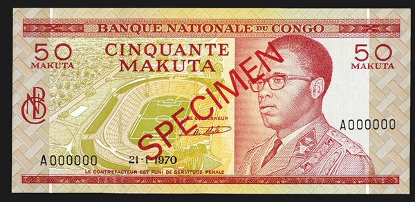 Congo. 50 Makuta. SCWPM 11s2. Mobutu at right, gathering coconuts on back. Overprint in red SPECIMEN on both sides. A paper bend makes this About Uncirculated.