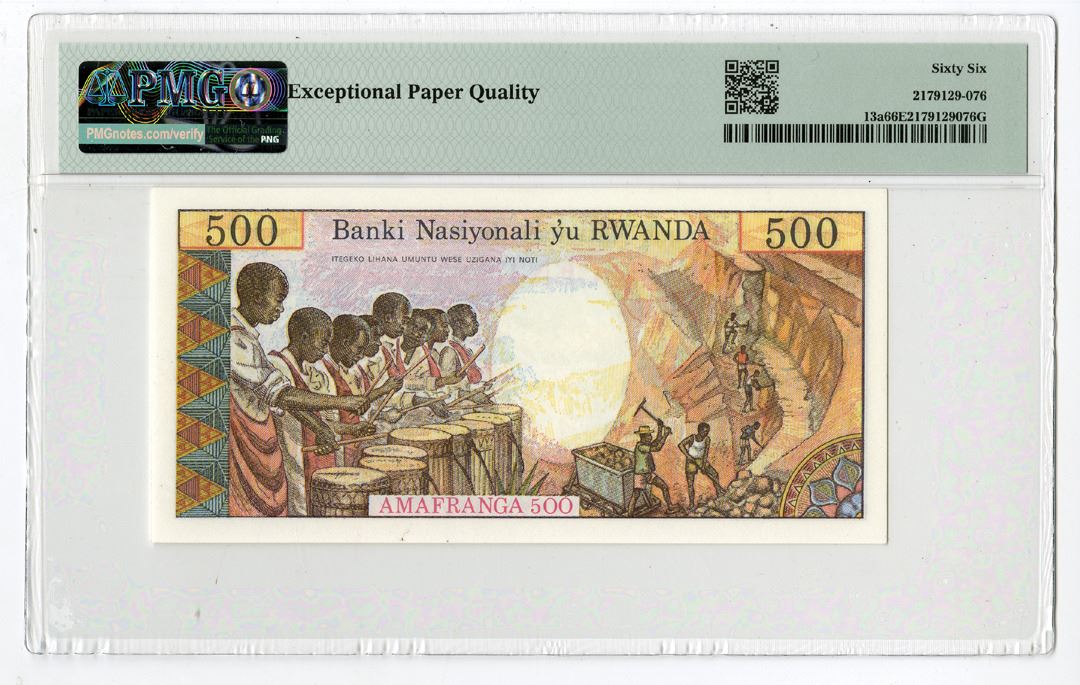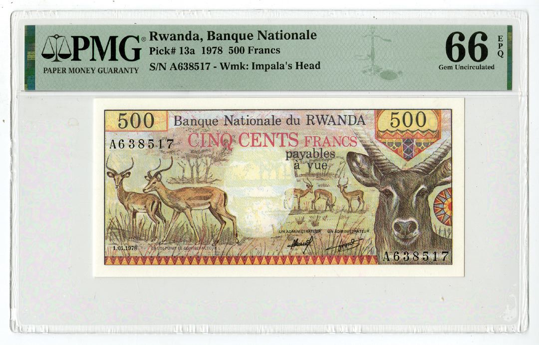 Rwanda, 1978. 500 Francs, P-13a, Issued Banknote, Black and m/c underprint with animals grazing, S/N A638517, PMG graded Gem Uncirculated 66 EPQ.