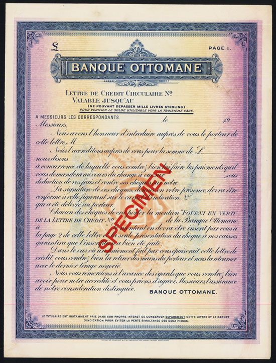 Turkey, 19xx (ca. 1910-20), 4-page engraved letter for with front page basic terms (in French), pg 2-3 for transaction details (French and some English) and back page ornate lathe work design. Specimen overprint, VF condition, Bradbury, Wilkinson & Co.