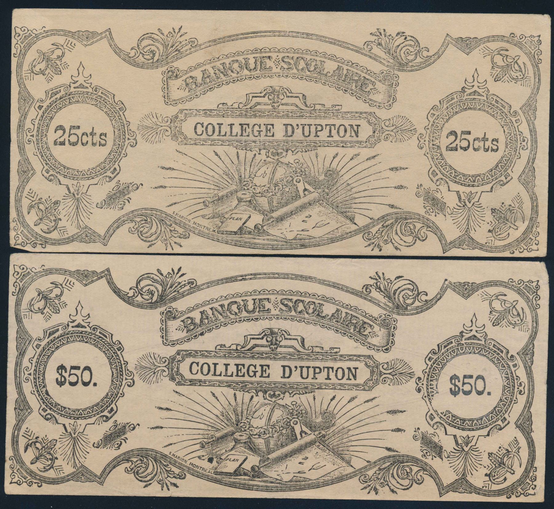 Banque Scolaire College D'Upton Lot of Two Notes, 25c, and $50