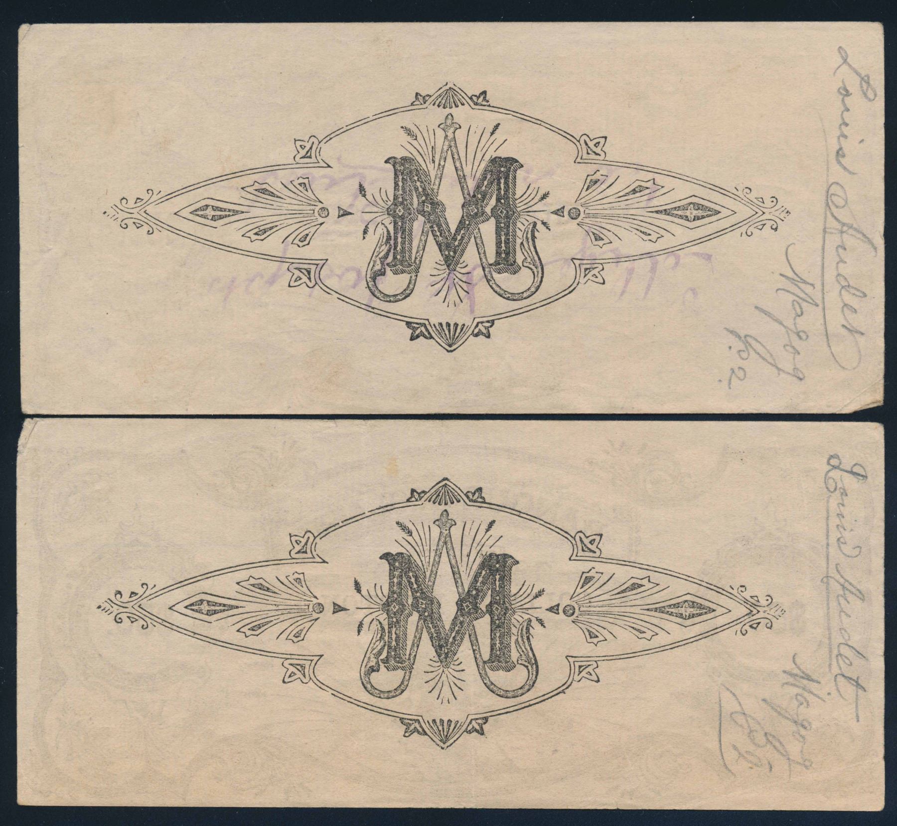 Identical designs, other than the denomination indicators. Simple black printing on brownish paper. Central representations of implements of Agriculture, Science and Education. The reverse is a large letter M ina guilloche. Both notes have a pencil inscription on the reverse right edge "Louis Audet / Magog / P. Q.