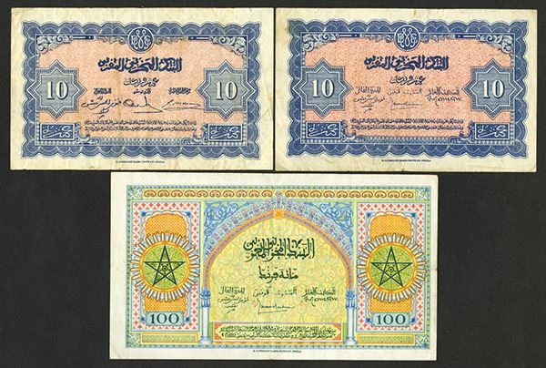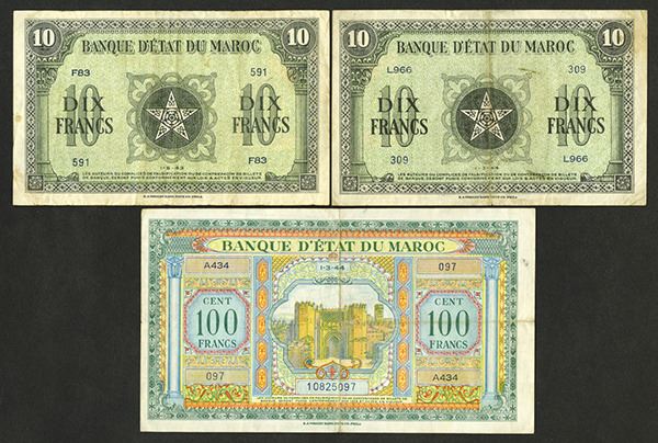 Morocco. 10, 100 Francs. P-25a 1.5.1943, 1.3.1944; 27 1.3.1944. The 100 features a city gate and is very colorful. Fine to Very Fine. 3 pieces.