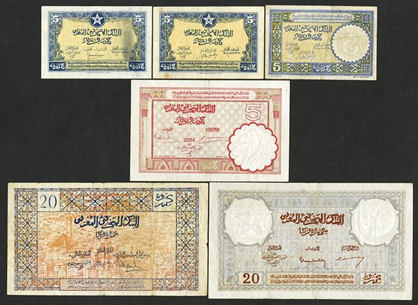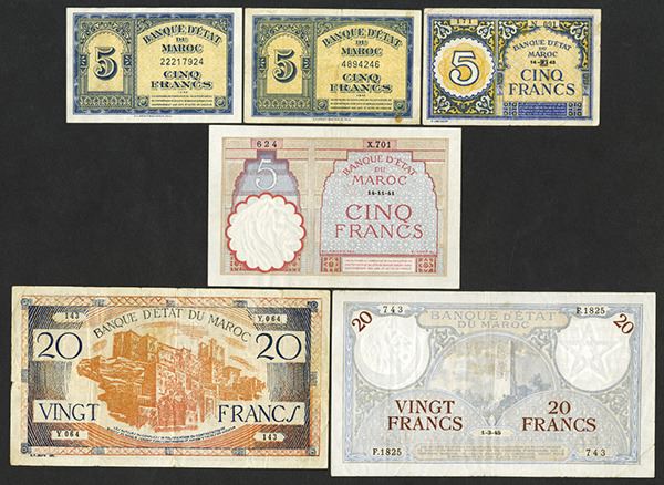 Morocco. 5, 20 Francs. P-12; 18b; 23Ab; 24a (2); 33. Generally Very Fine, some with spots. 6 pieces.